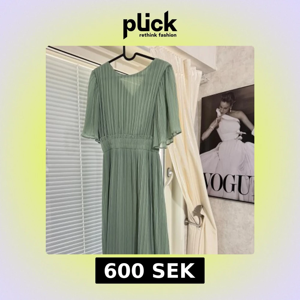 Säljer en elegant ljusgrön långklänning med plisserat tyg och lös passform. Klänningen har korta, vida ärmar och markerad midja. Perfekt för dig som vill ha en stilren och luftig look.