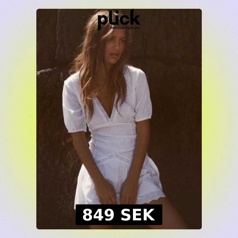 Söt vit kortklänning med v-ringning, omlottdesign och spetsdetaljer. Klänningen har korta puffärmar och volangkant nertill. Perfekt för sommarens varma dagar och har en lätt, luftig känsla.