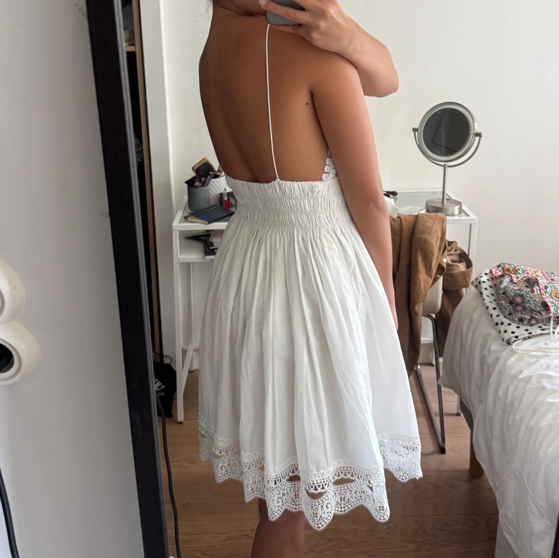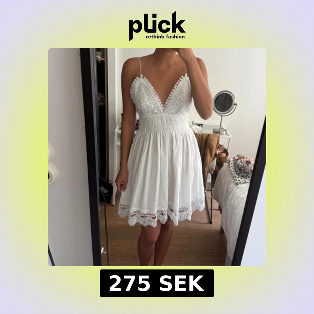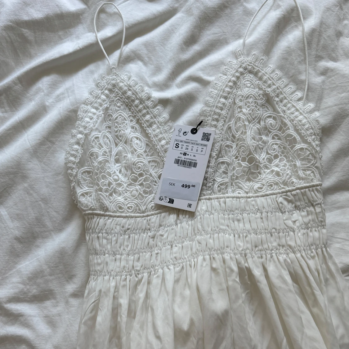 Supersöt vit kortklänning från Zara med tunna axelband, v-ringad spets upptill och smockad midja. Kjolen är lätt och har broderad spetskant. Öppen rygg och romantiska detaljer gör den perfekt för sommarens alla tillfällen. Materialet är bomull.