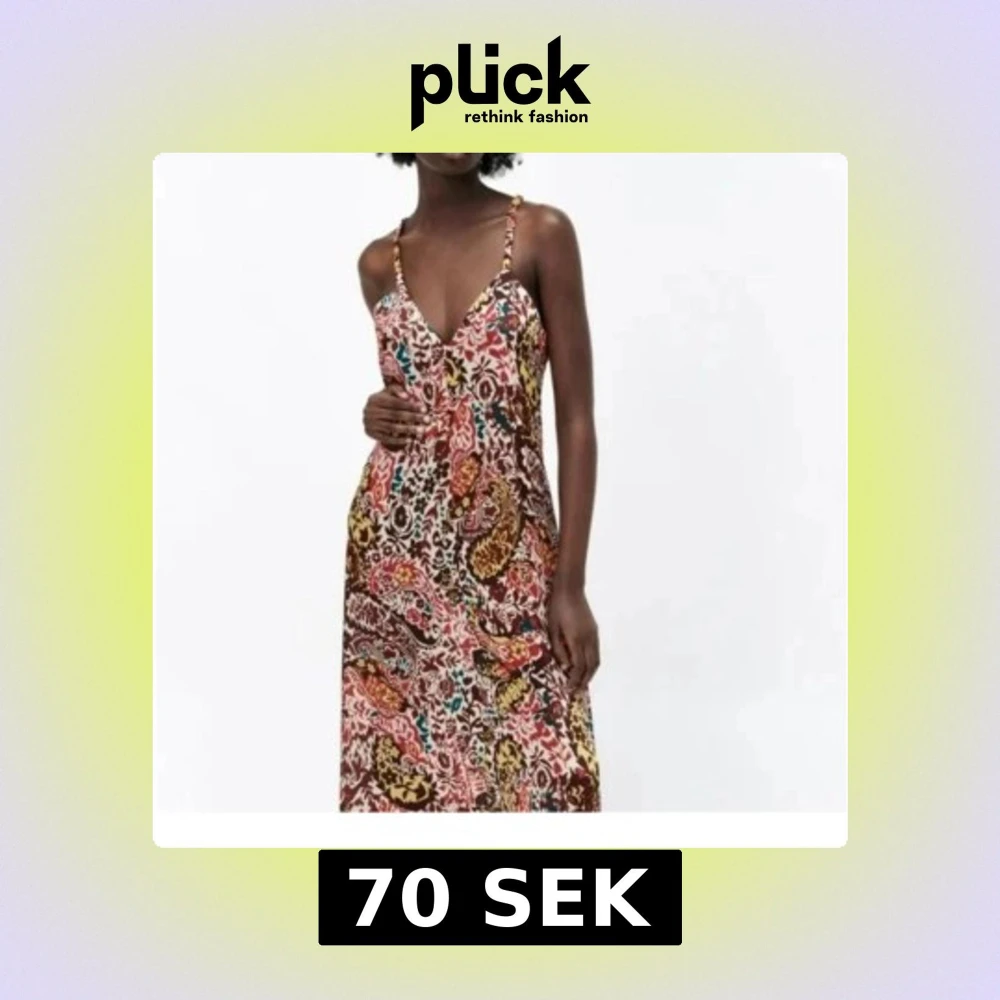 Säljer en färgstark långklänning med blommigt mönster i rött, brunt, gult och turkost. Klänningen har v-ringning, smala axelband som korsas i ryggen och ett flowigt fall.