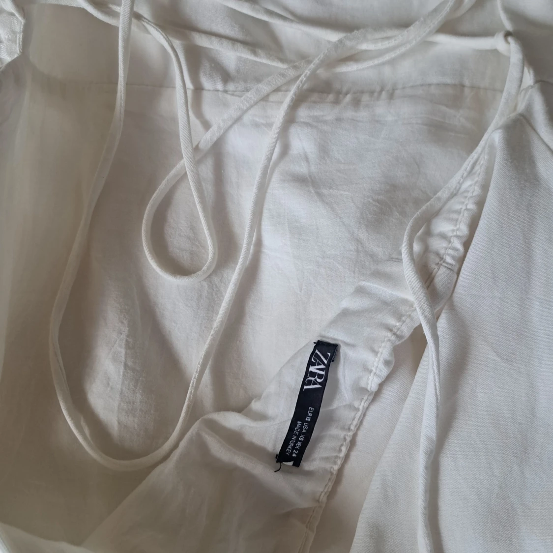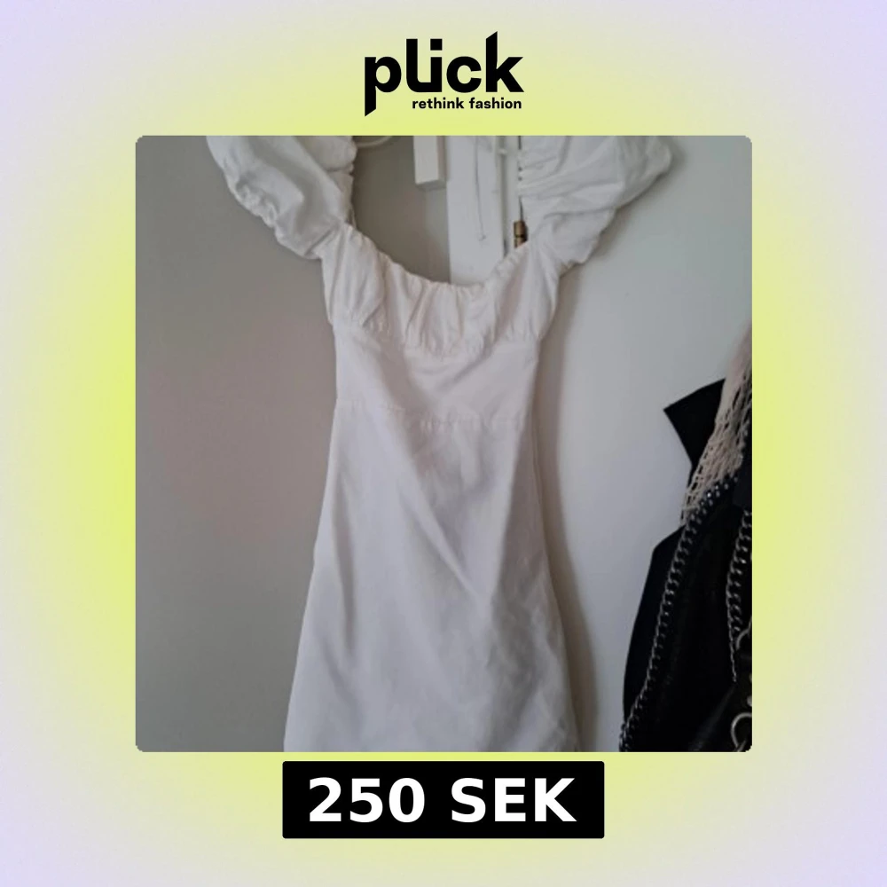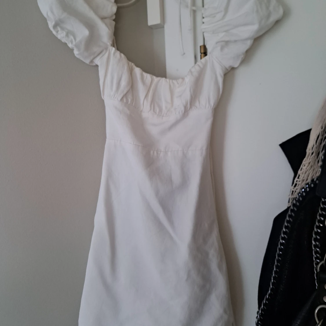 Supersöt vit kort klänning från Zara med puffiga kortärmar och öppen rygg med snörning. Klänningen har en figurnära passform och är gjord i mjukt bomullstyg. Perfekt för sommarens alla tillfällen när du vill känna dig extra fin.