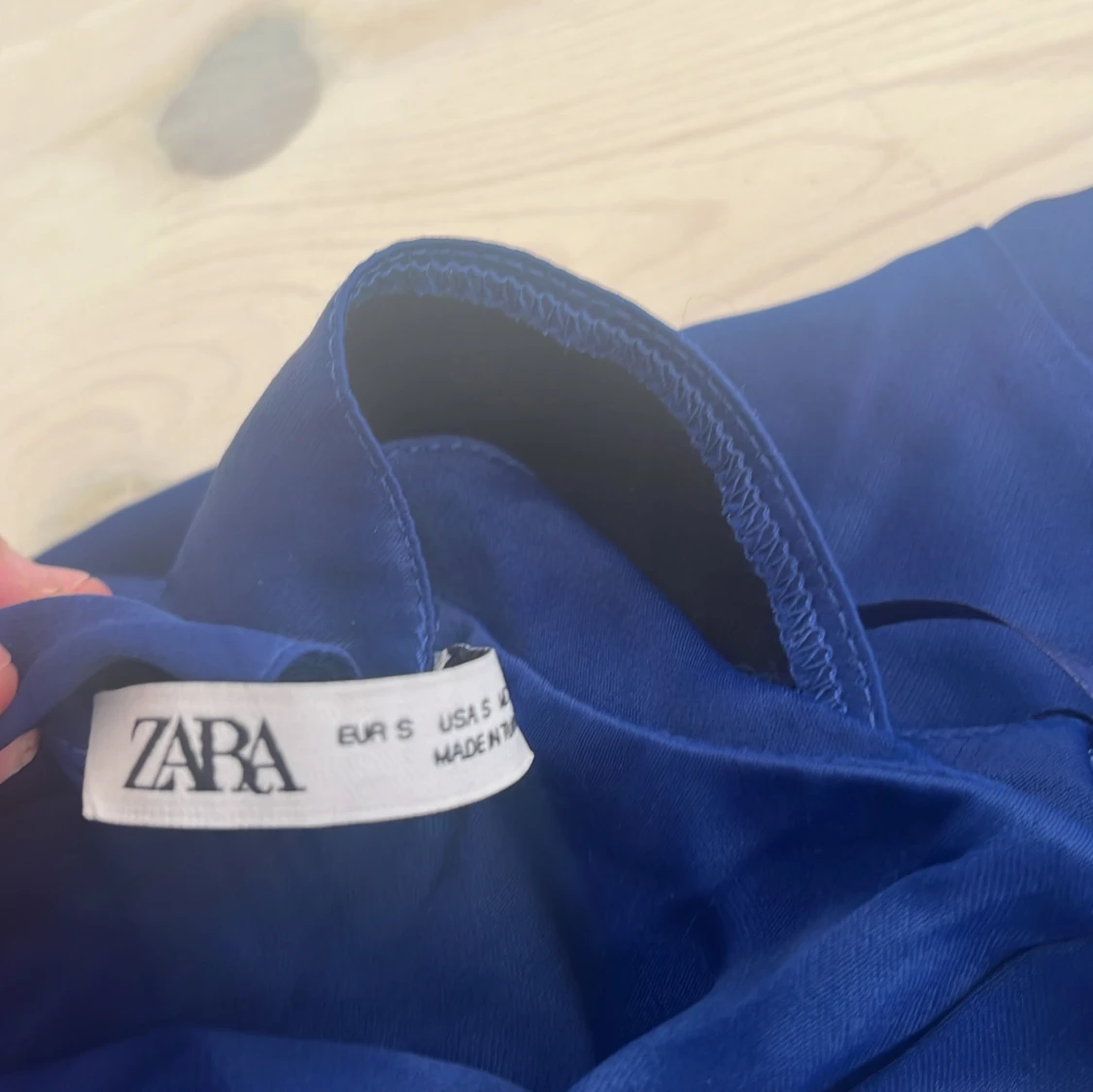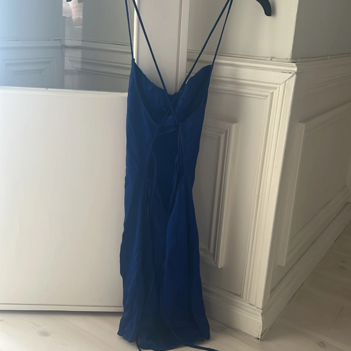Säljer en snygg blå långklänning från Zara i storlek S. Klänningen har smala axelband, omlott-detalj i ryggen och en elegant, figurnära passform. Materialet är mjukt och har ett lätt glansigt utseende som ger en lyxig känsla. Perfekt för dig som gillar stilrena och trendiga plagg.
