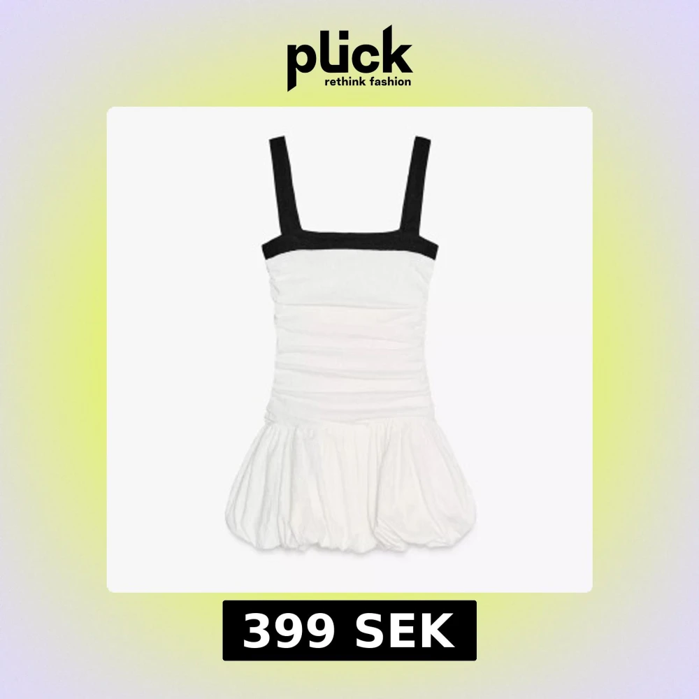 Supersöt vit kortklänning med svarta breda axelband och fyrkantig urringning. Klänningen har en rynkad överdel och en puffig kjol som ger en cool och trendig siluett. Perfekt för dig som gillar att sticka ut med stilren kontrast. Köpt för bara någon månad sen och använd en gång, slutsåld på hemsidan!