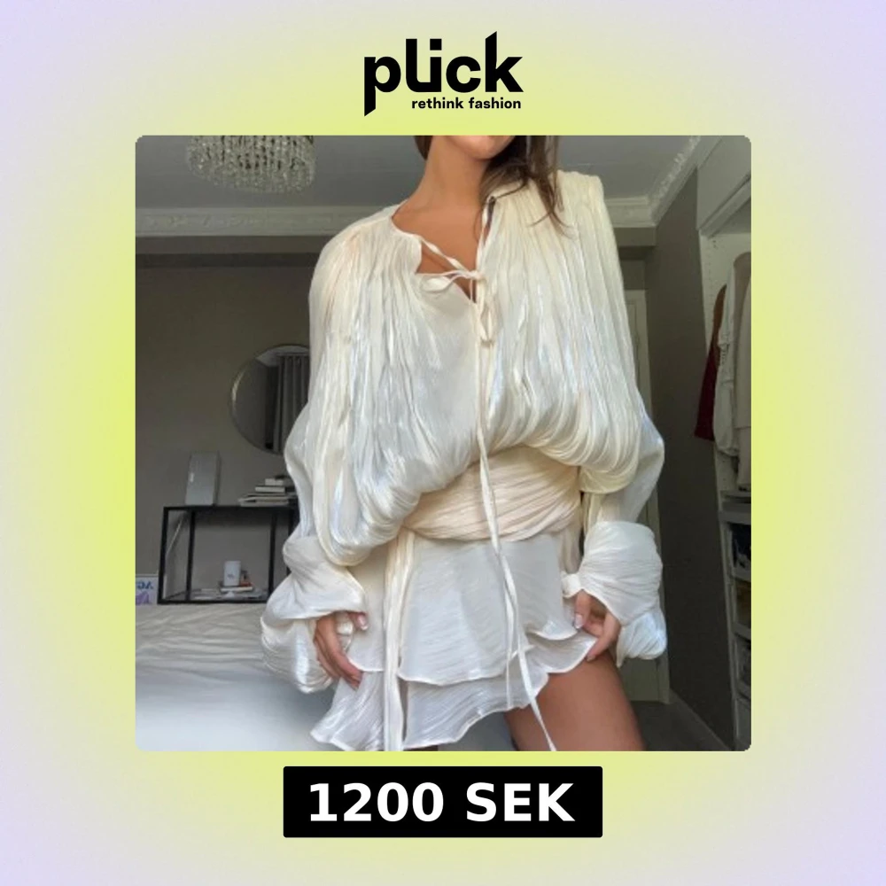 Säljer en superfin Miss Rosier klänning i champagnefärgad ton med glansigt, plisserat tyg. Klänningen har omlottmodell, långa puffiga ärmar och snörning vid halsen. Kjolen är kort med volangkant och ger en flowy vibe. Perfekt för dig som gillar unika plagg med lyxig känsla. Den är helt oanvänd och det ingår shorts!
