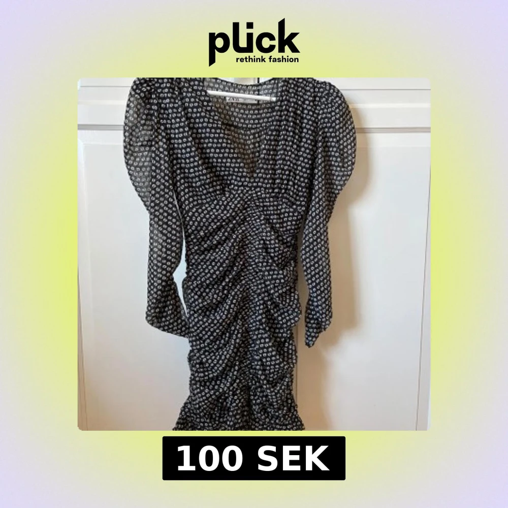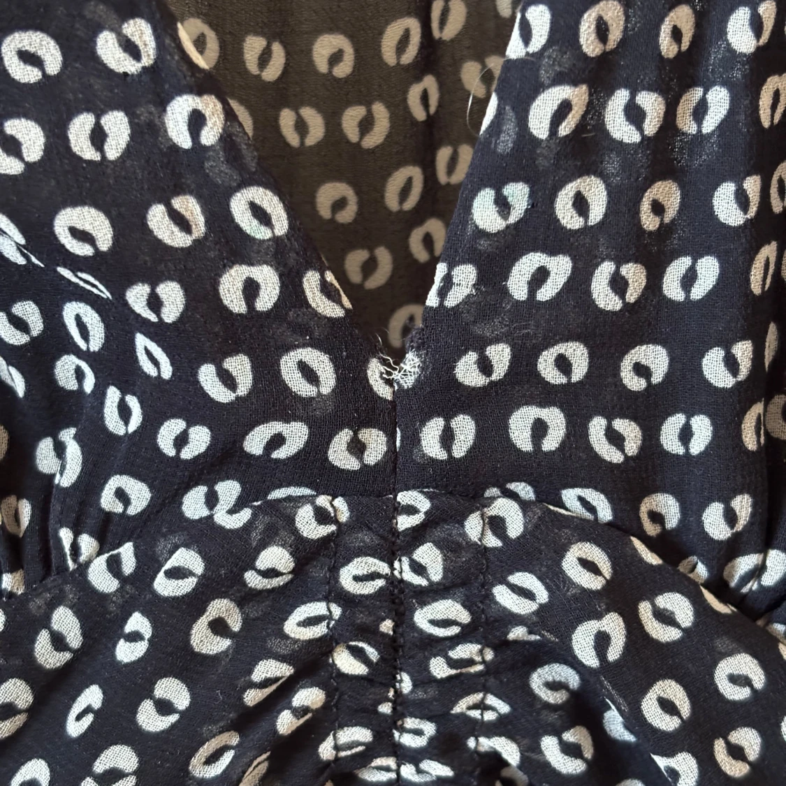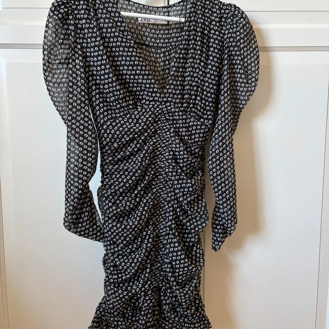 Snygg klänning från Zara med vita prickar och rynkade detaljer.