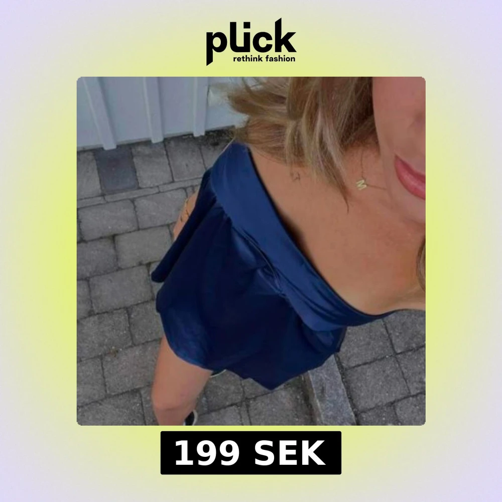 Snygg mörkblå offshoulder klänning i satin. Hittade en bild bara, men kan ta fler bilder om det behövs 💕💕