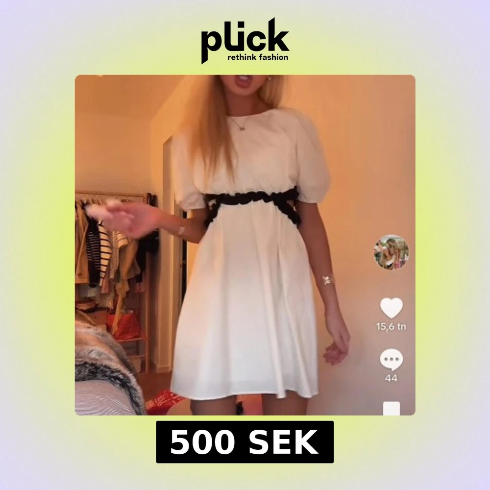 Söt vit kortklänning med puffärmar och svart vågig detalj i midjan. Endast använd en gång!!! Skriv för fler bilder!! Storlek 164 men passar xs-s