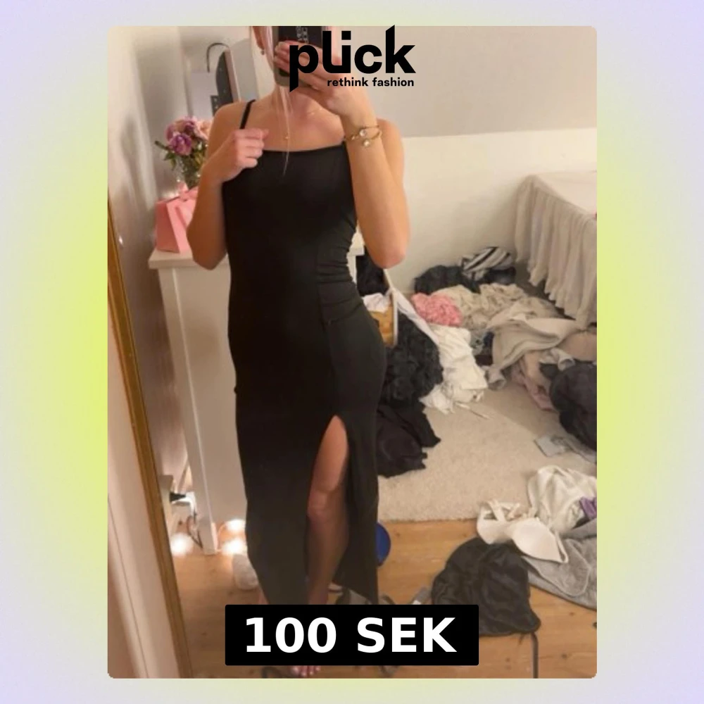 Säljer en svart långklänning med smala axelband och en snygg slits framtill. Klänningen har en figurnära passform och enkel, stilren design som ger en elegant look. Perfekt för dig som vill ha något klassiskt men ändå trendigt.