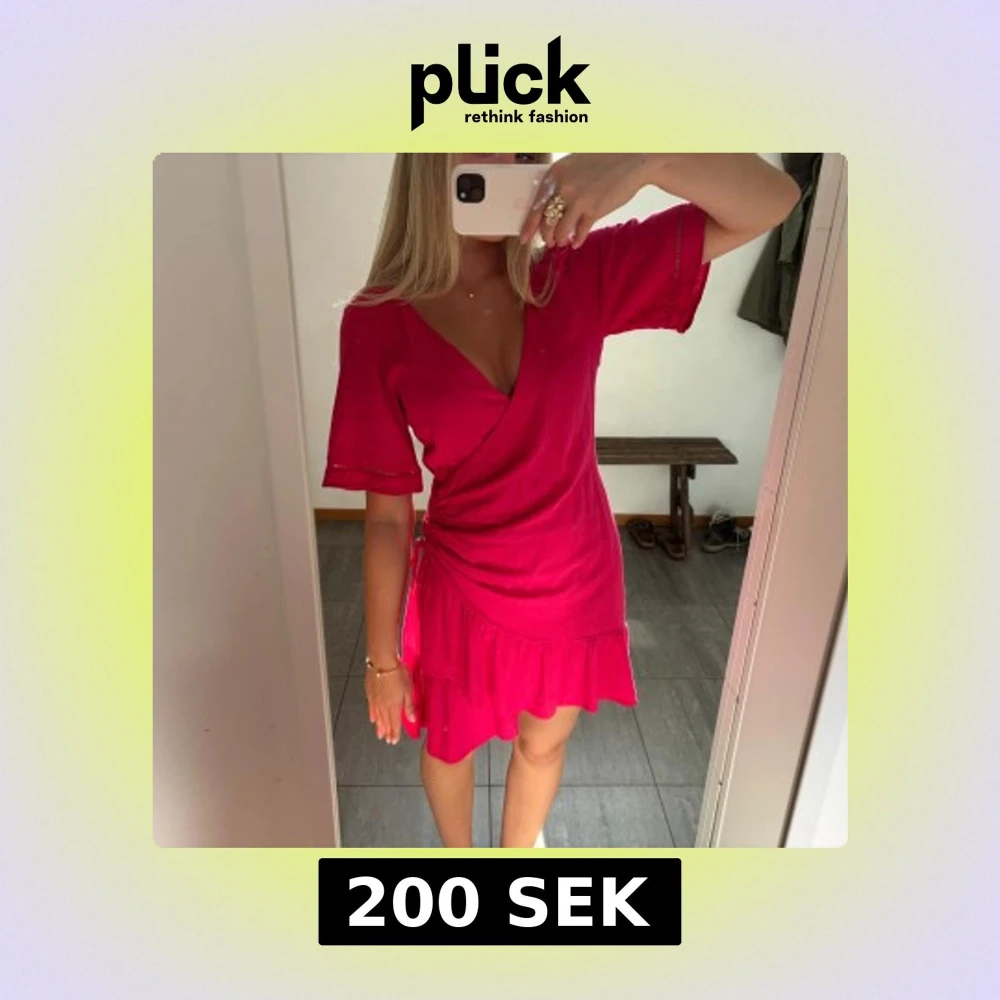 Supersöt rosa linne klänning från Zara med omlottmodell, v-ringning och knyt i sidan. Klänningen har korta ärmar med fina detaljer och volang nertill för en extra feminin touch. Använd 2-3 gånger och är i princip i nyskick!