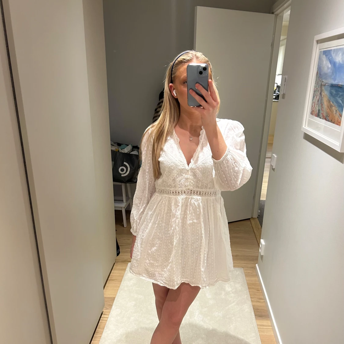 Säljer en vit klänning med spetsdetaljer och v-ringning från Zara. Den är aldrig använd men har ej lappen kvar.