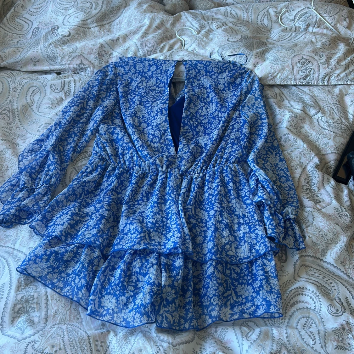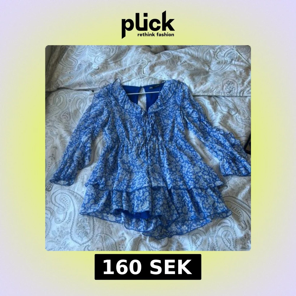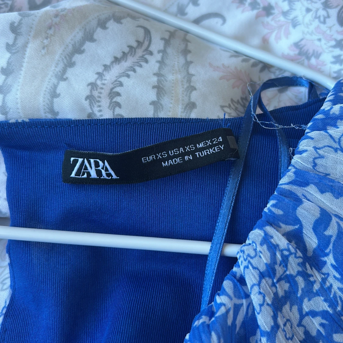 Supersöt blå och vit kortklänning från Zara med blommigt mönster, volanger och långa ärmar. Klänningen har snörning framtill, markerad midja och lätt transparent tyg med innerfoder. Perfekt för sommarens alla tillfällen!