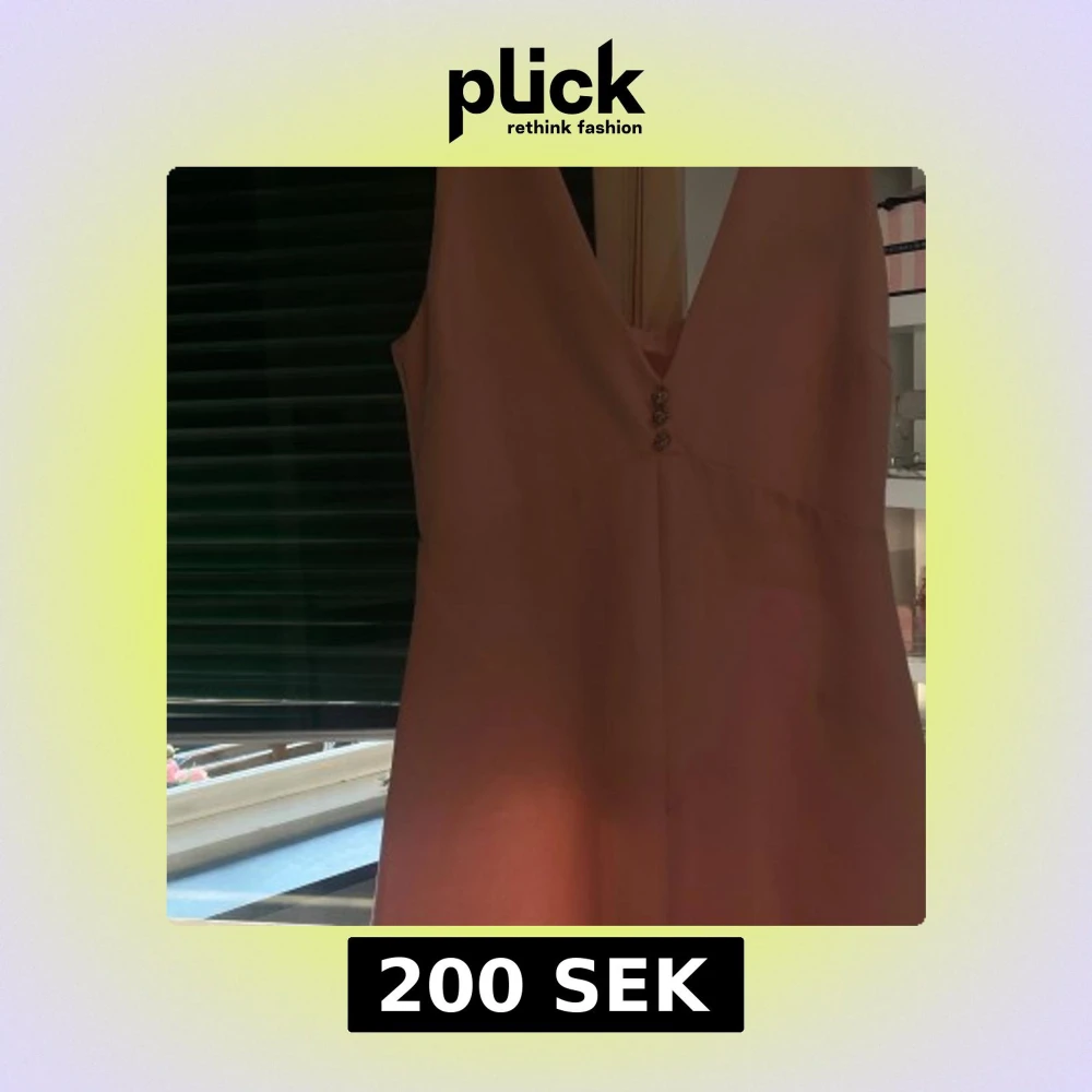 Säljer en ljusrosa klänning med djup v-ringning och dekorativa knappar framtill. Klänningen är ärmlös och har en elegant, enkel design som passar perfekt till sommarens tillfällen.