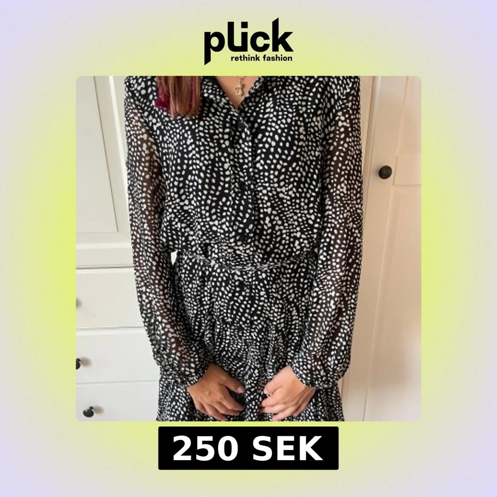 Säljer en svartvit kortklänning från Zara med prickigt mönster. Klänningen har långärmade transparenta ärmar, knappar framtill och ett knytband i midjan för snygg passform. Materialet är lätt och luftigt, perfekt för att sticka ut med coola detaljer.