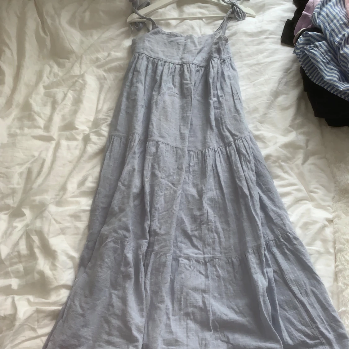Luftig och flowy ljusblå långklänning från Zara med smala axelband som knyts. Klänningen har flera volanger, perfekt för varma dagar. Enkel och stilren design med avslappnad passform.