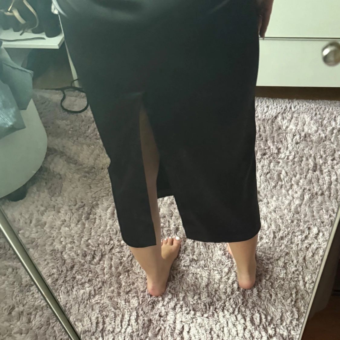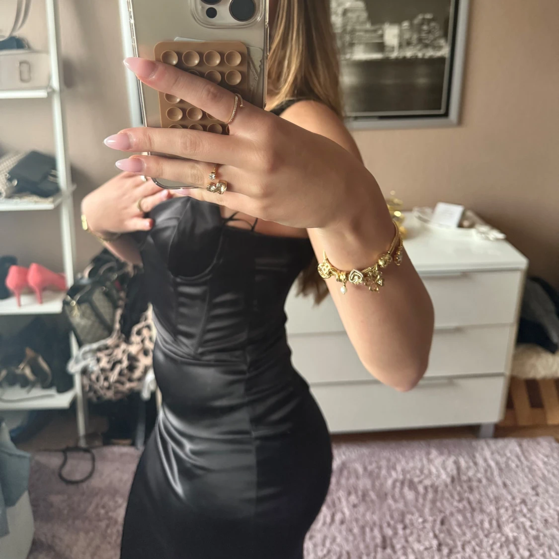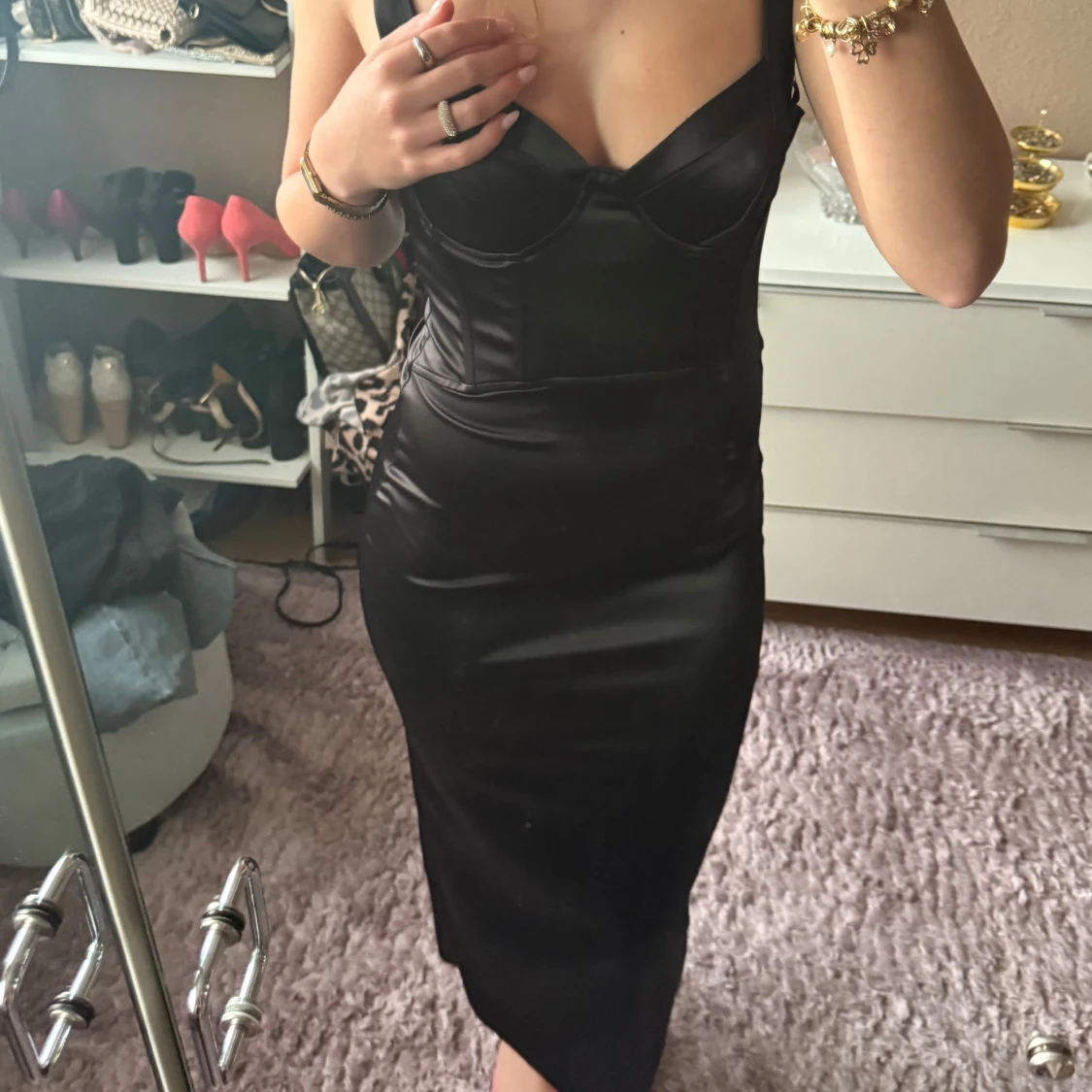 Supersnygg svart långklänning i satin med figurnära passform och markerad corsagetopp. Klänningen har breda axelband, djup urringning och slät, glansig yta som ger en lyxig känsla. Perfekt för dig som vill sticka ut och känna dig extra glam. Endast använd fåtal gånger!
