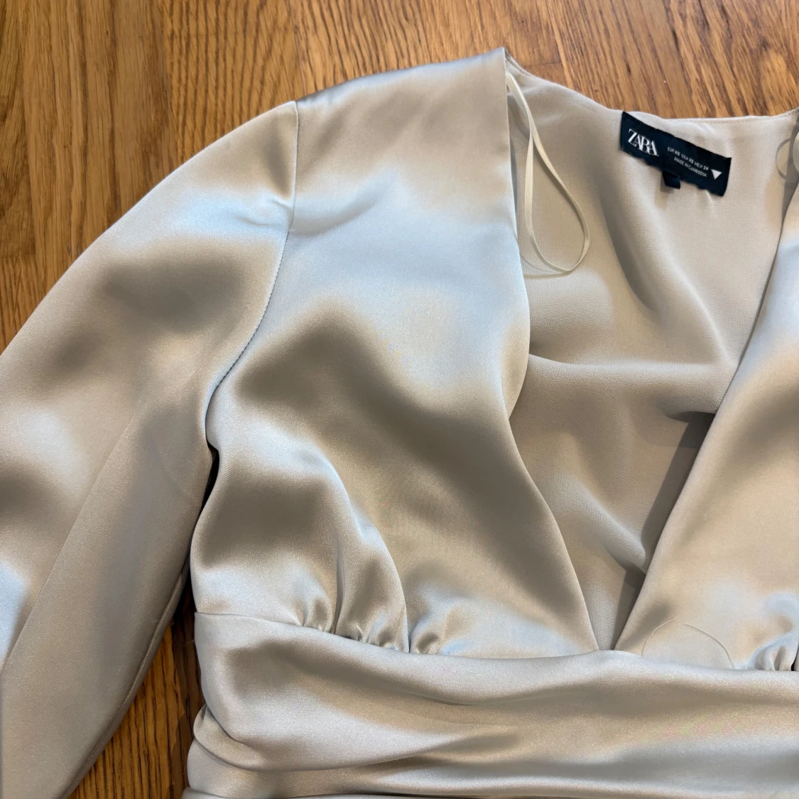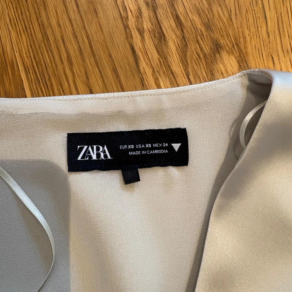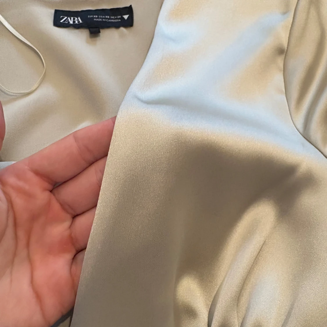 Superfin kort klänning från Zara i storlek Xs. Färgen är en blandning mellan lite grön och champagnefärg. Använd endast en gång och säljer pågrund av att den inte passar mig längre💞