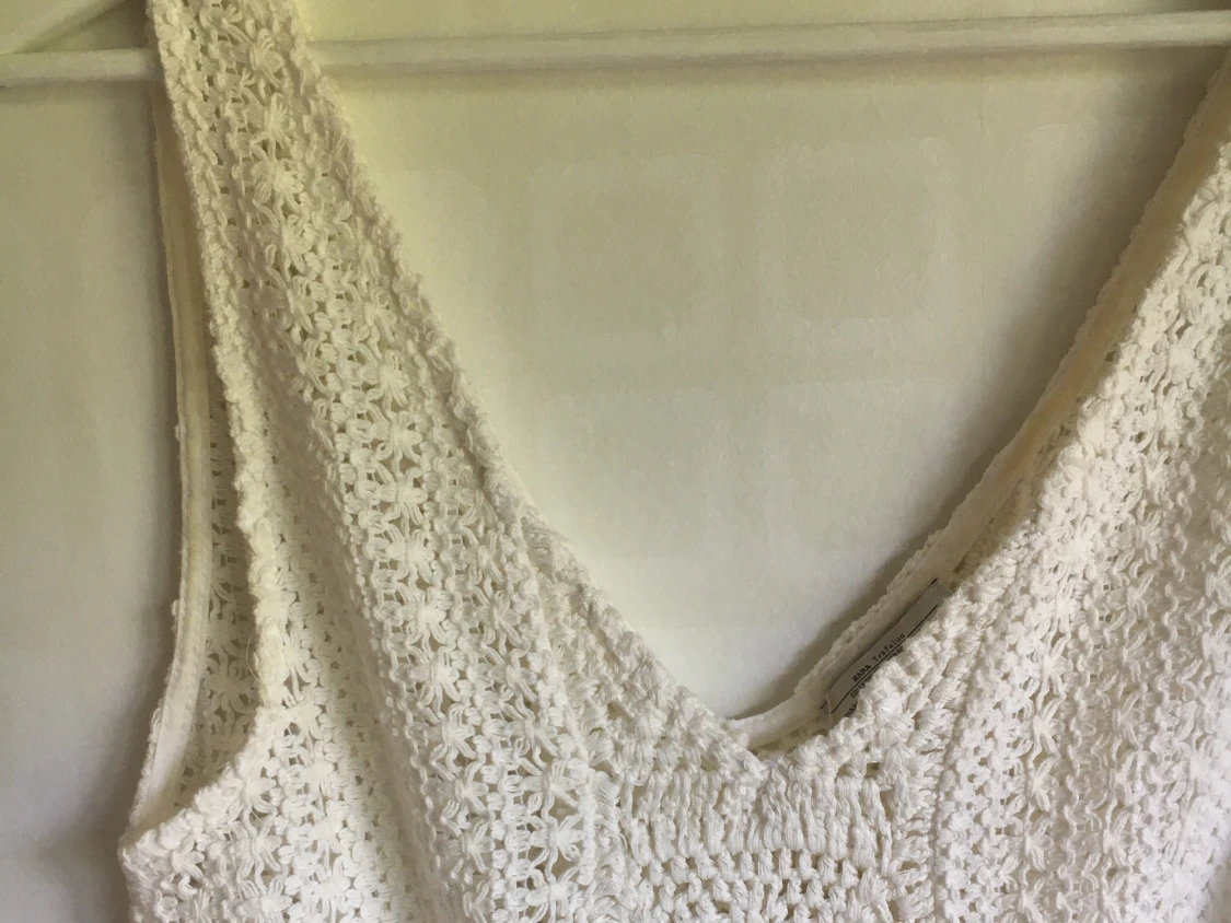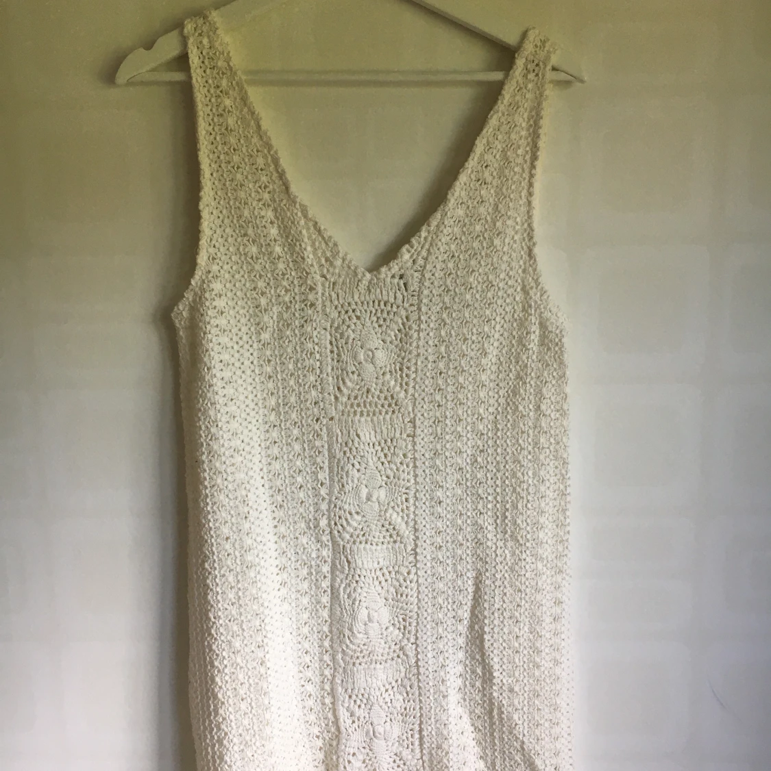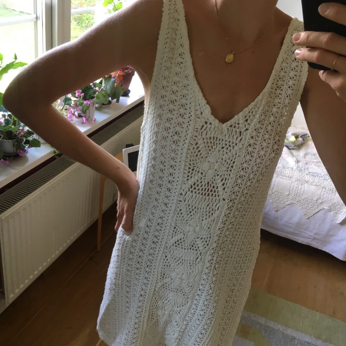 Supergullig vit virkad sommarklänning från Zara. Säljer för att den inte har kommit till användning, den är endast använder gång så helt i nyskick! (Ljuset på bilden gör att den ser lite gul ut, mensen är helt vit!!) Kan mötas upp i Lund elr posta:)