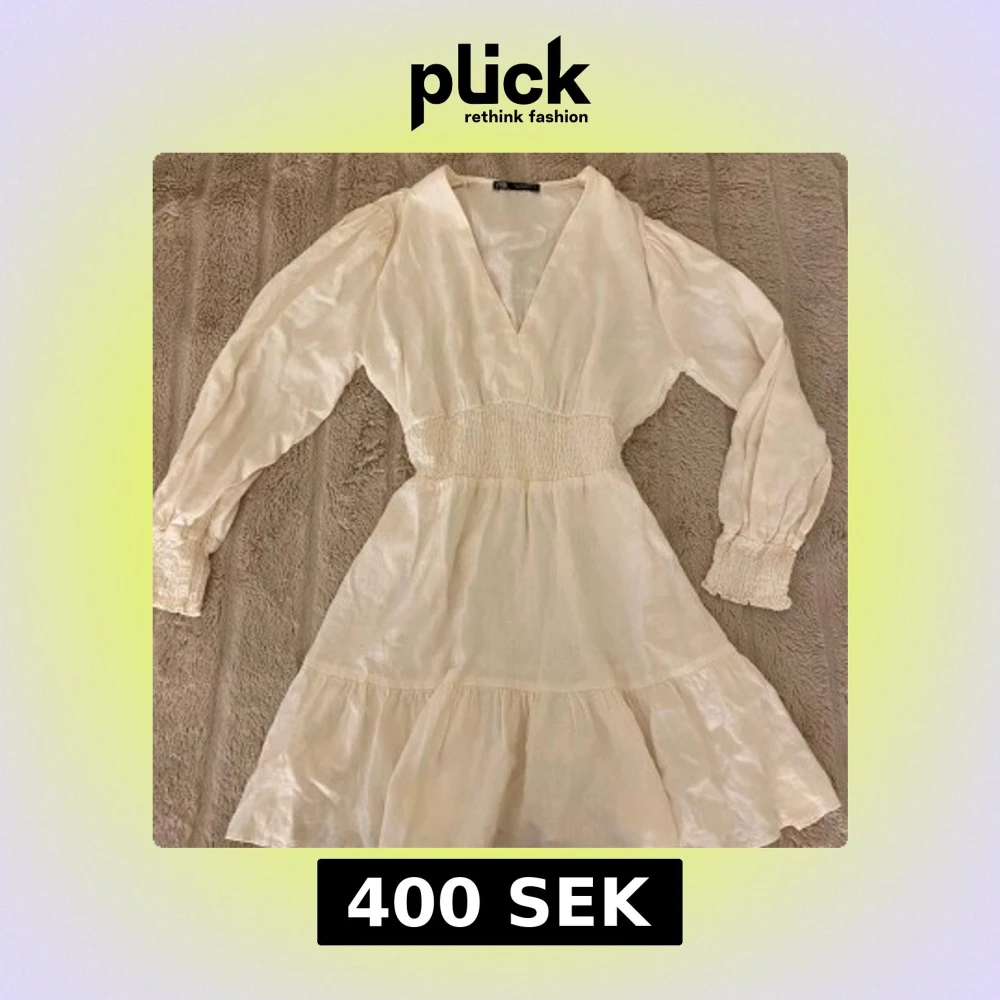 Elegant vit klänning från Zara gjord av linne, med v-ringning och långa ärmar. Klänningen har en smockdetalj i midjan och volang nedtill, vilket ger en fin siluett. Perfekt för en stilren look. Säljer då den tyvärr blivit för liten 💗