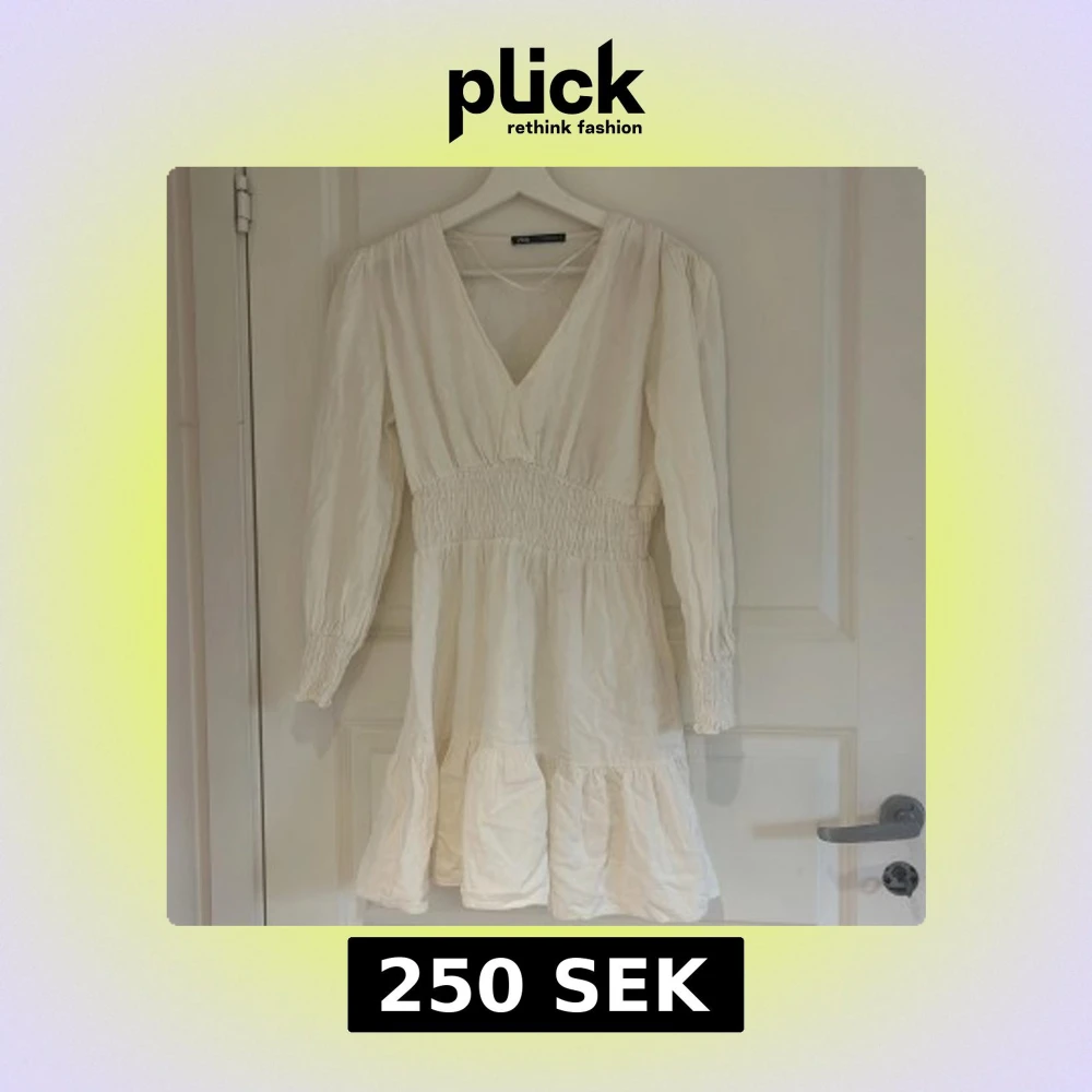 Säljer en söt vit klänning från Zara med v-ringning och långa ärmar. Klänningen har smock i midjan och vid ärmslut samt volang nertill. Perfekt för vår och sommar, enkel att styla med sneakers eller sandaler. Den är i linne. Defekter förekommer