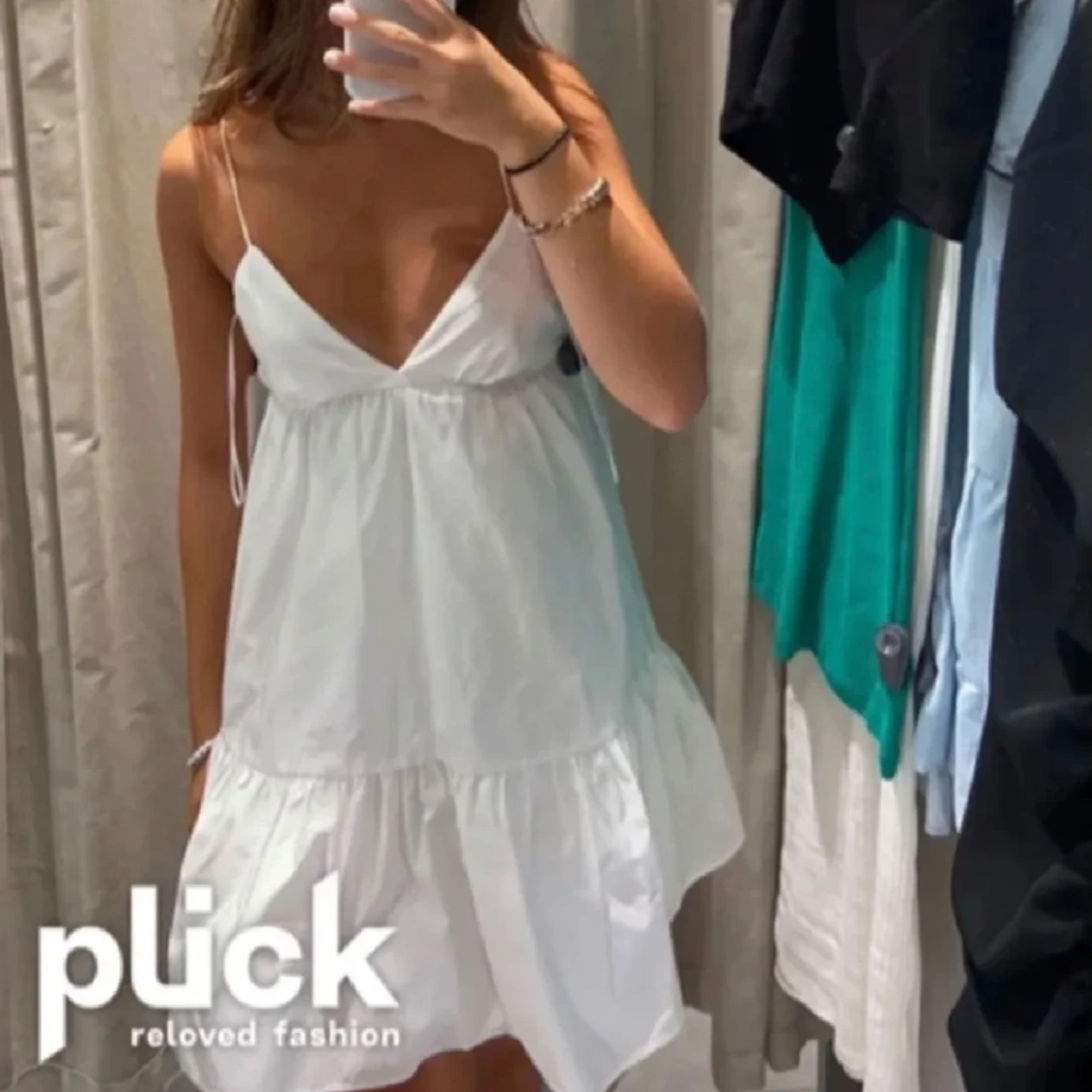 Söt vit klänning med v-ringning och volangdetaljer. Den är ärmlös och har en luftig passform, perfekt för varma dagar. Köpt på Plick men passade tyvärr inte. Finns lite sminkfläckar på insidan men inget man tänker på!