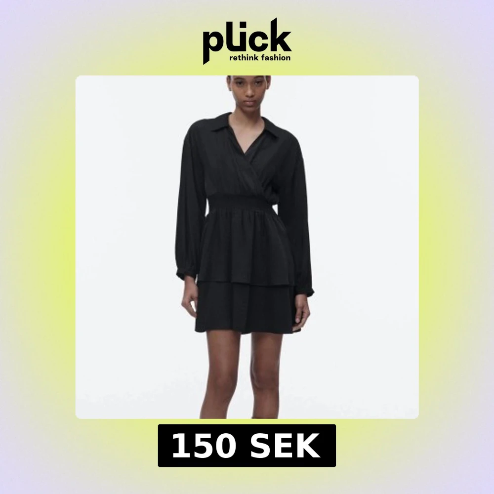 Supersnygg svart kort omlottklänning från Zara med v-ringning, långa ärmar och markerad midja. Klänningen har volangdetaljer och en lätt glansig finish som ger en lyxig känsla. Perfekt för dig som gillar stilrena och trendiga plagg. 50% viscose/50% poliester