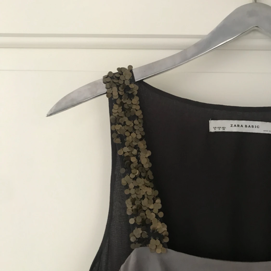Säljer denna i princip oanvända festklänningen med volanger och paljettaxelband från ZARA! Storlek : S men passar även M ( lite större i storleken) Köpare står för frakten. Jag tar Swish!