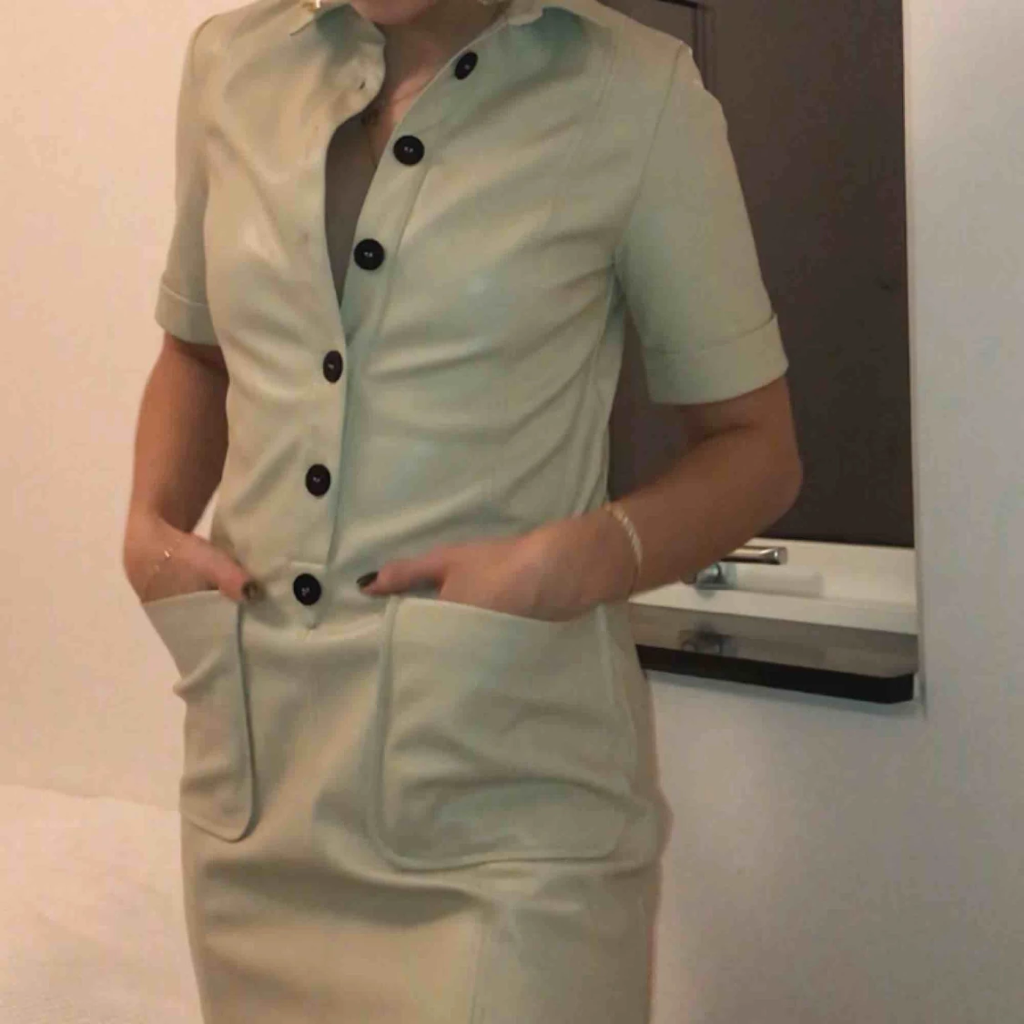 Säljer SNYGGASTE klänningen från ZARA i nån slags läder/skinnimitation😍 helt oanvänd och säljer endast för att den är lite för kort för mig som är 173cm💓💓 så är man XS-S och kortare än jag kommer den passa perfekt🙏