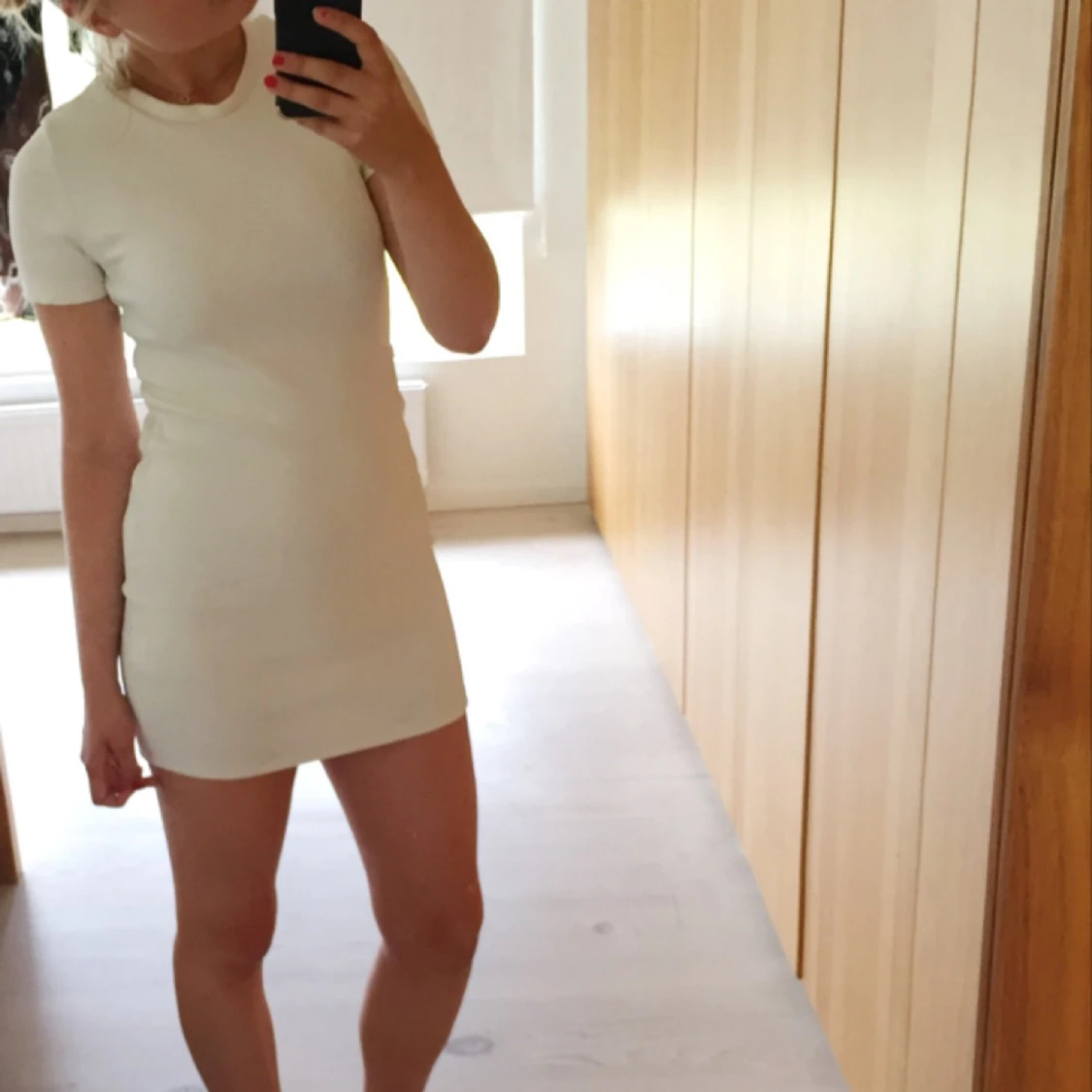 Vit t-shirtklänning i stretchigt material. Köpt på Zara i Spanien. Står att den är storlek medium men den funkar absolut för den som har small också. Perfekt som vardagsklänning.