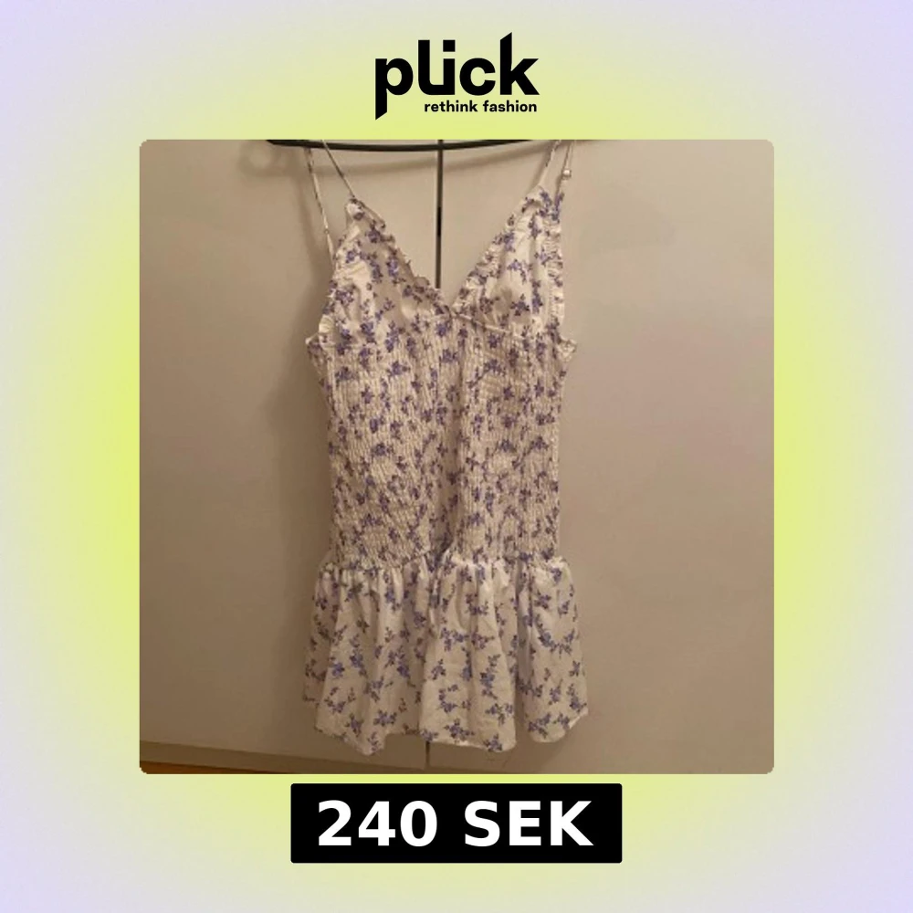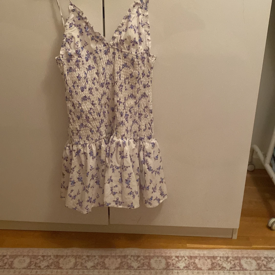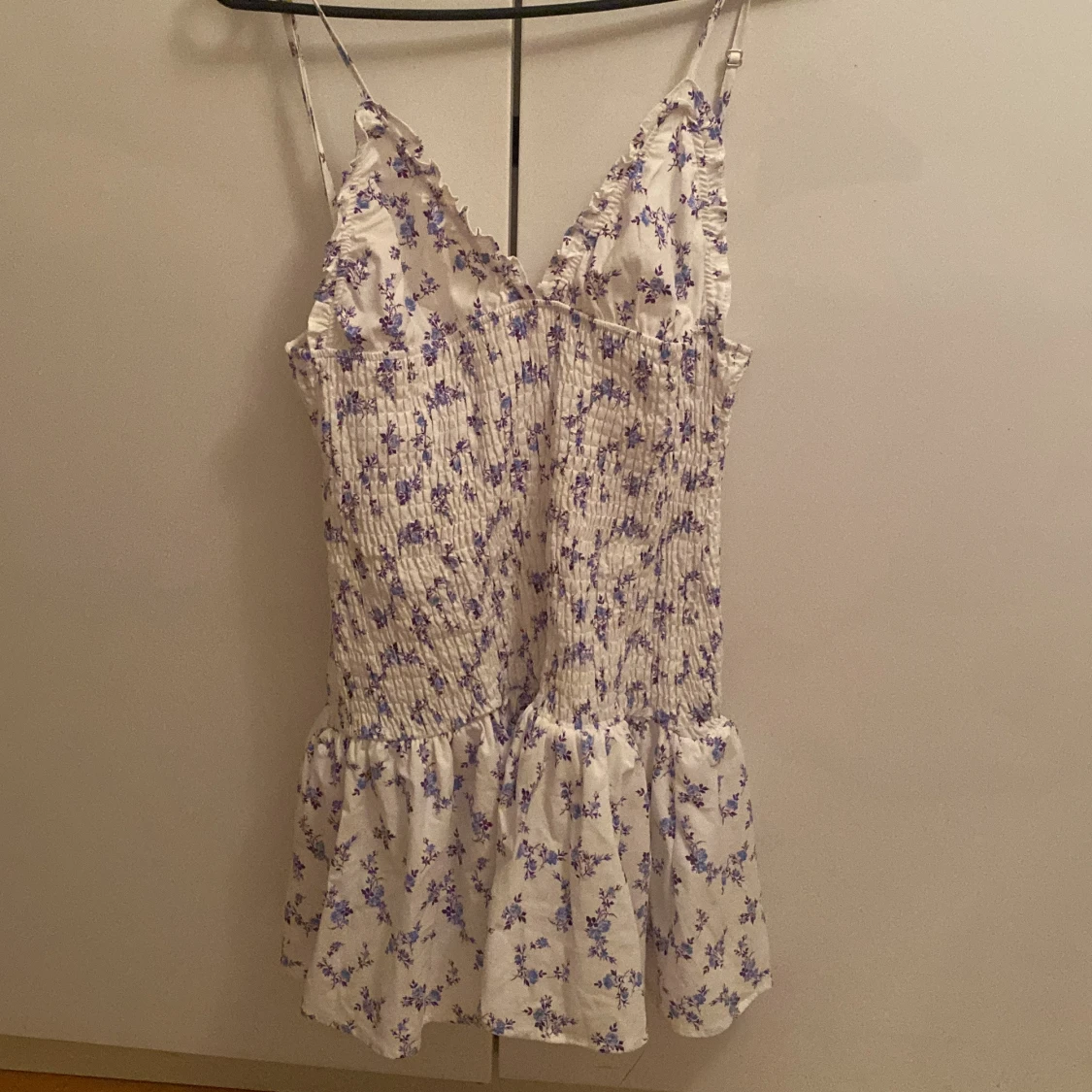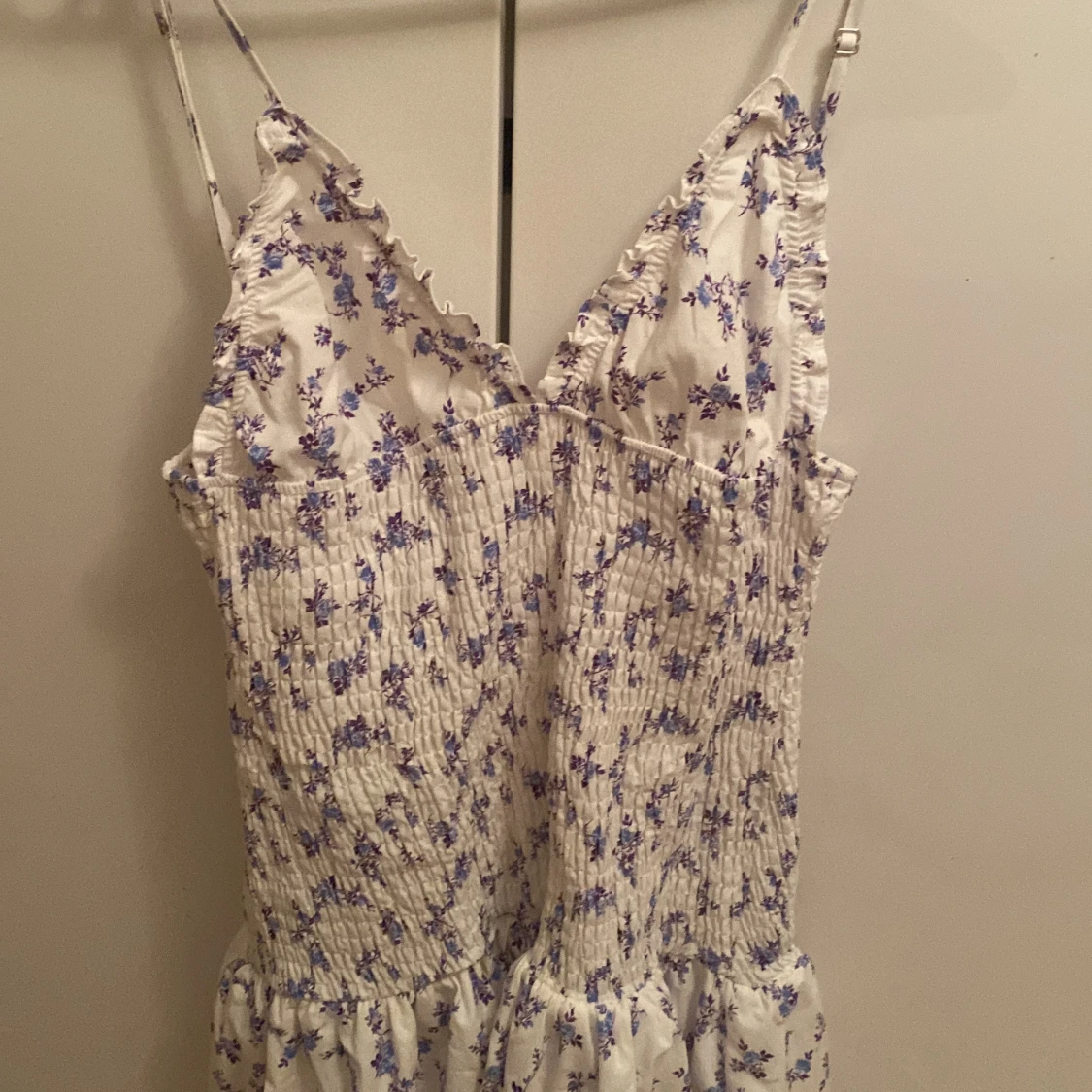 Supersöt vit kortklänning med lila blommor, smockad överdel och volang nertill. Klänningen har smala justerbara axelband och v-ringad hals med små volangdetaljer. Perfekt för varma dagar och somriga vibes!