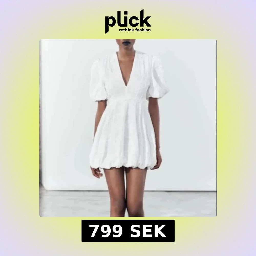 Superfin vit kortklänning med puffärmar och v-ringning. Klänningen har en ballongformad kjol och markerad midja som ger en söt och trendig siluett. Perfekt till student eller sommarens alla tillfällen.