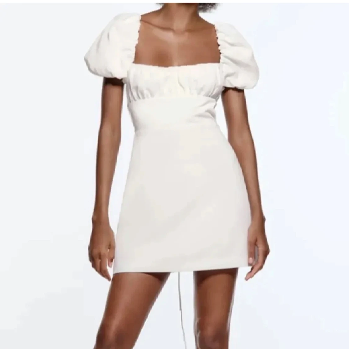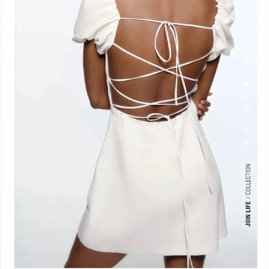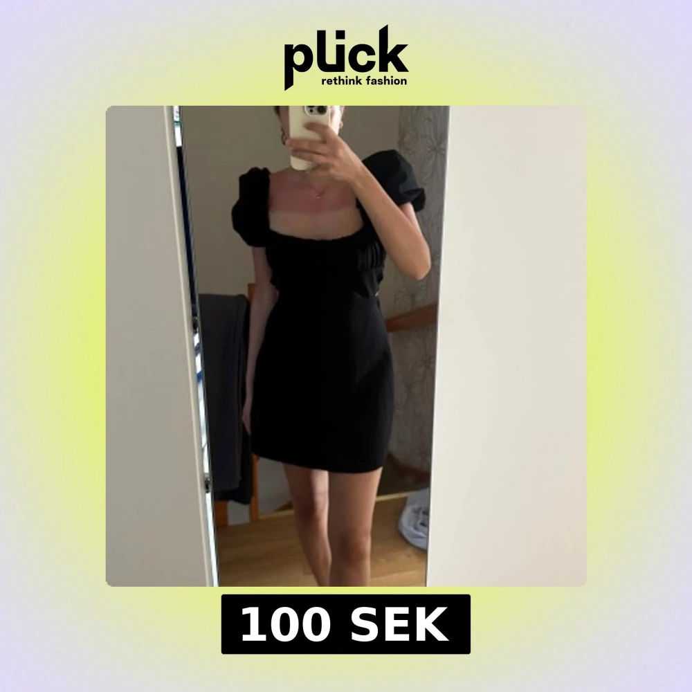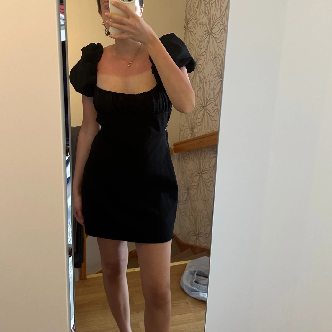 Trendig kort klänning med puffärmar och fyrkantig urringning. Klänningen har en snygg öppen rygg med snörningsdetaljer. Perfekt för dig som vill sticka ut med en feminin och modern look. Säljer den svara