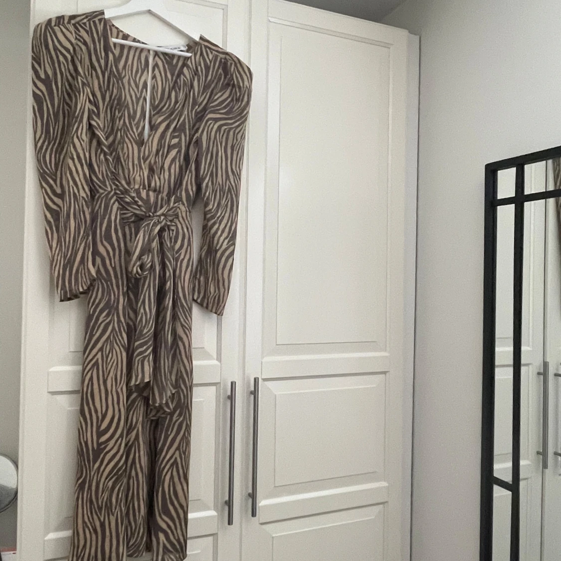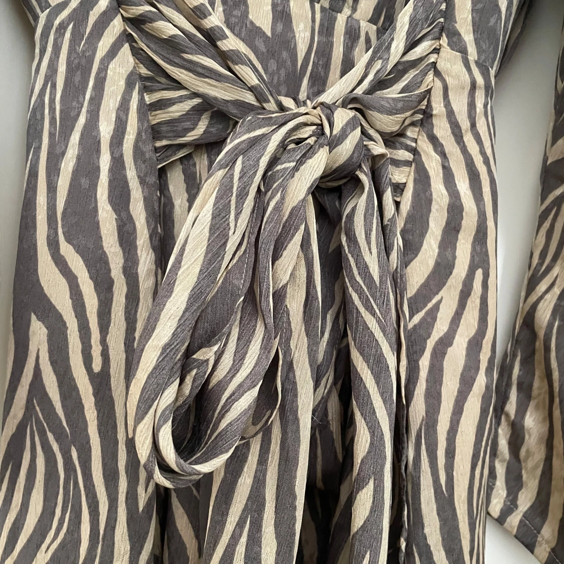 klänning från Adoore med zebramönster i beige och brunt. Klänningen har långa ärmar, markerad midja med knytband och lätt puff vid axlarna. Storlek 36