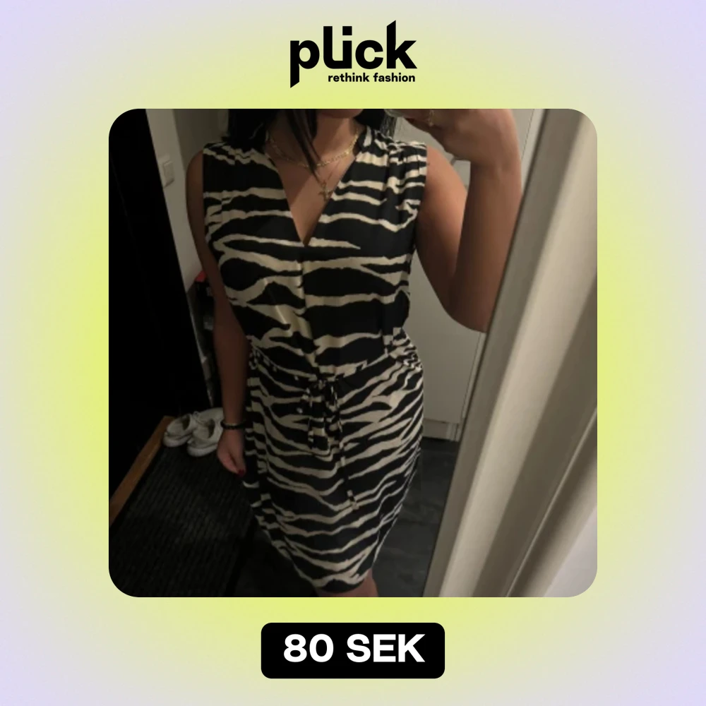Säljer en superfin zebramönstrad klänning i svart och beige. Den har en v-ringad hals och är ärmlös, vilket gör den perfekt för sommaren. Klänningen har ett knytband i midjan för en snygg passform.