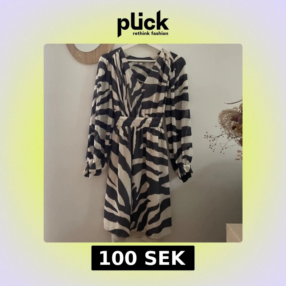 Snygg kortklänning med svartvitt zebramönster och v-ringning. Klänningen har långa ärmar med lätt puff och ett brett knytband i midjan som ger en markerad siluett. Perfekt för dig som vill sticka ut med en trendig look. Passar perfekt till ett par boots