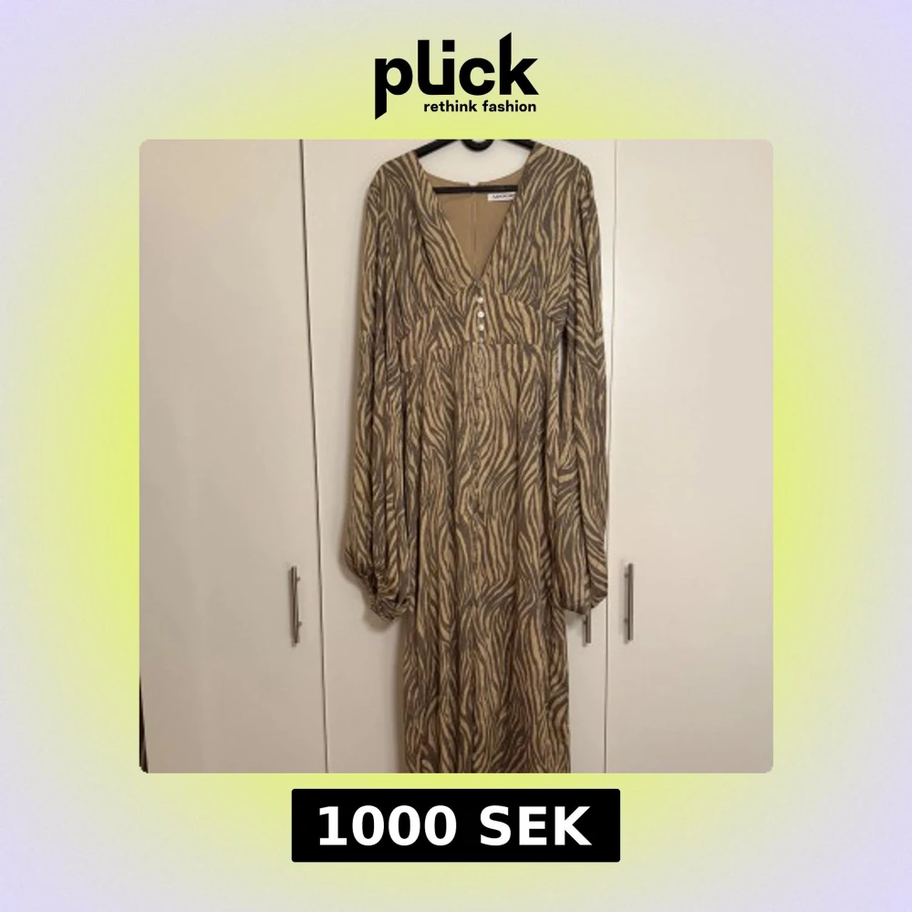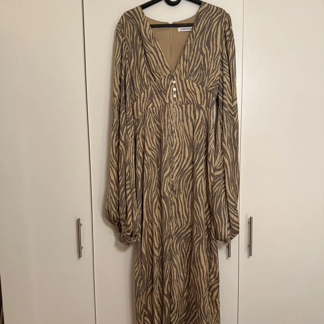 Snygg långklänning från Adoore med zebramönster i beige och brunt. Klänningen har v-ringning, knappar framtill och långa, puffiga ärmar. Perfekt för dig som vill sticka ut med ett coolt mönster och avslappnad passform.