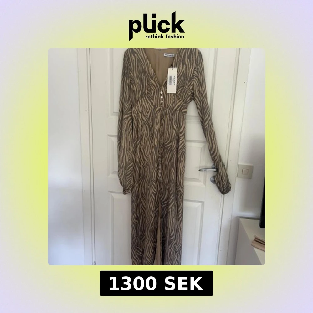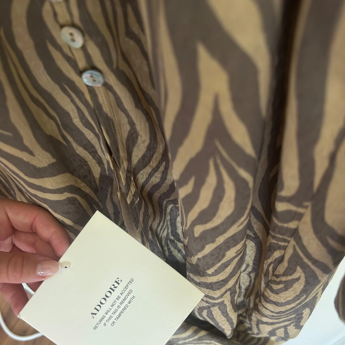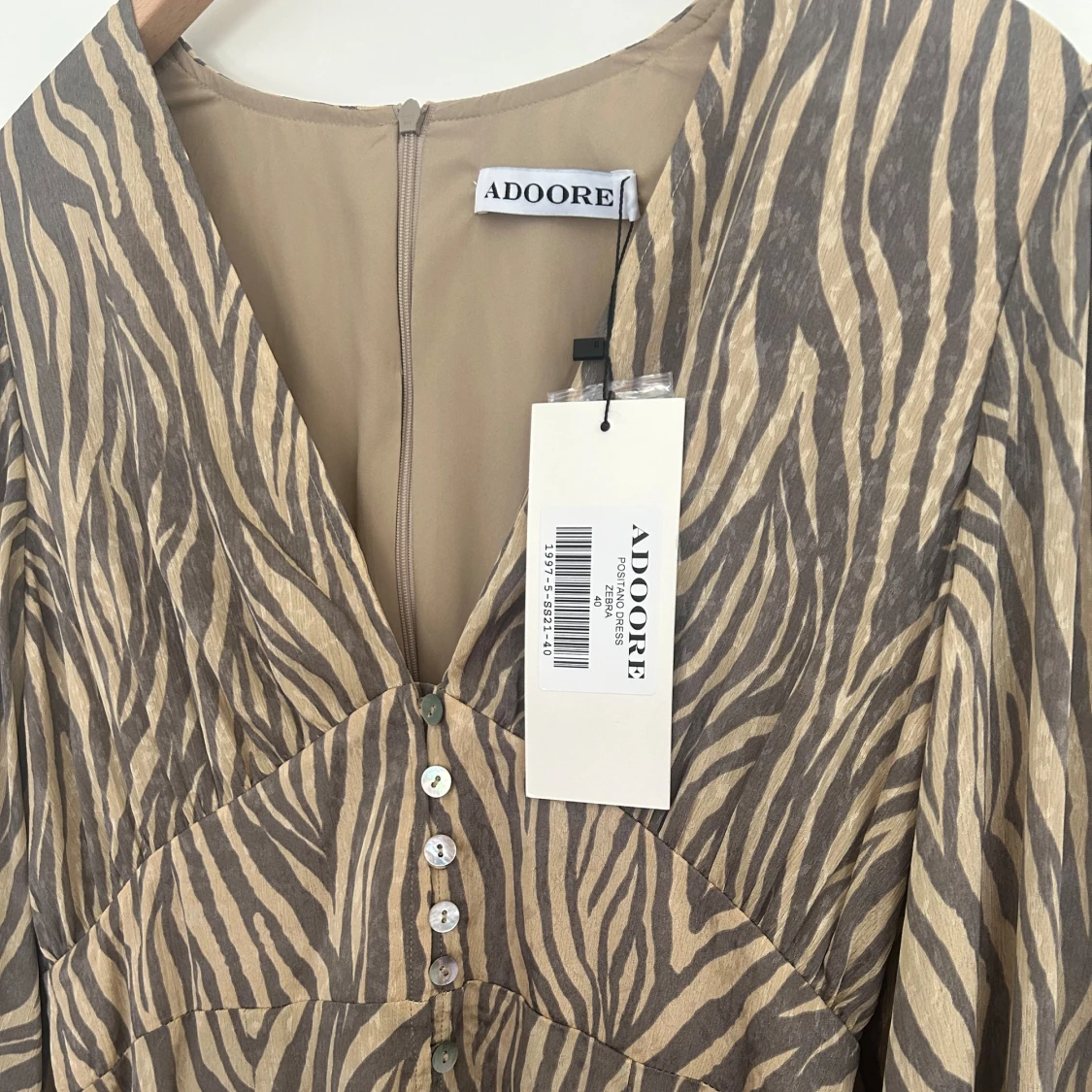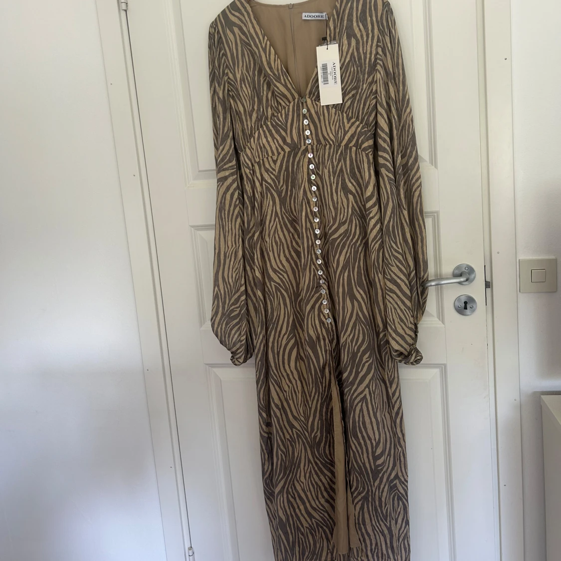 Helt oanvänd endast testad klänning från Adoore. Långklänning med zebramönster i beige och brunt. Klänningen har v-ringning, långa ärmar och knappar framtill. Storlek 40 men lite mindre i storlek