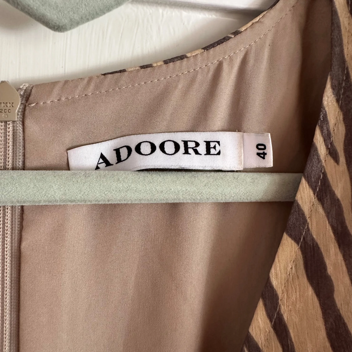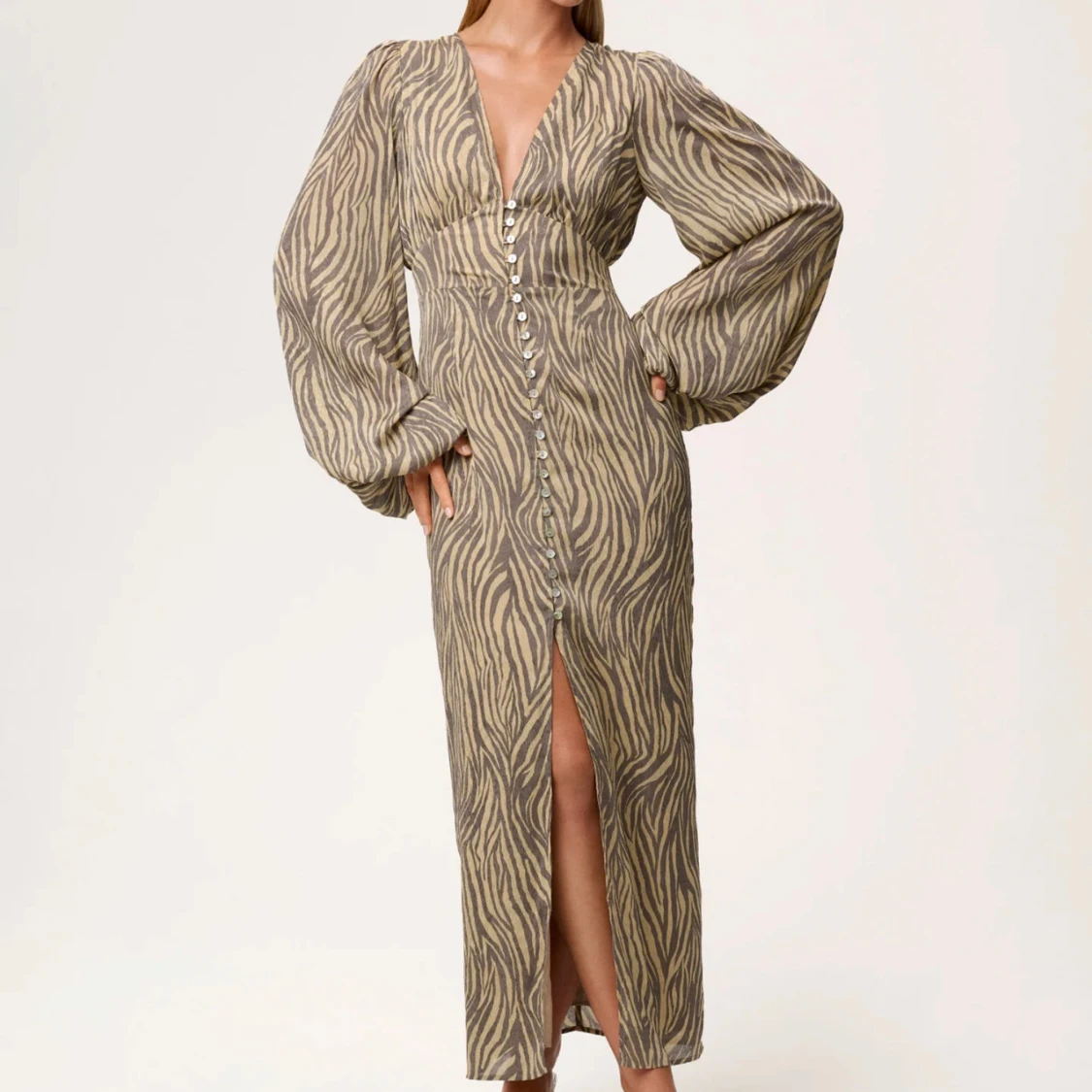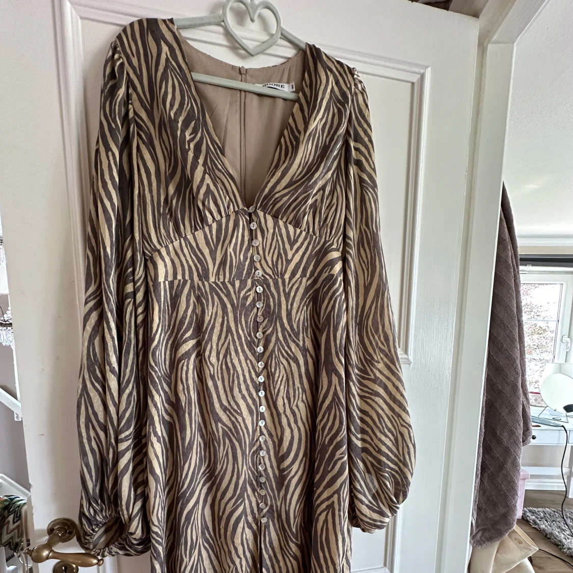 Supersnygg långklänning från Adoore med zebramönster i beige och brunt. Klänningen har djup v-ringning, långa puffärmar och knappar hela vägen framtill. Använd endast 3 gånger