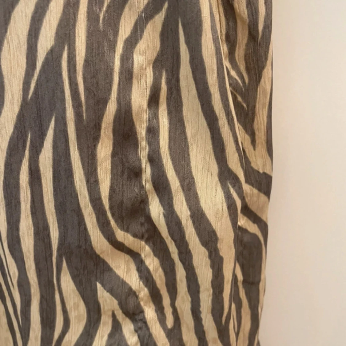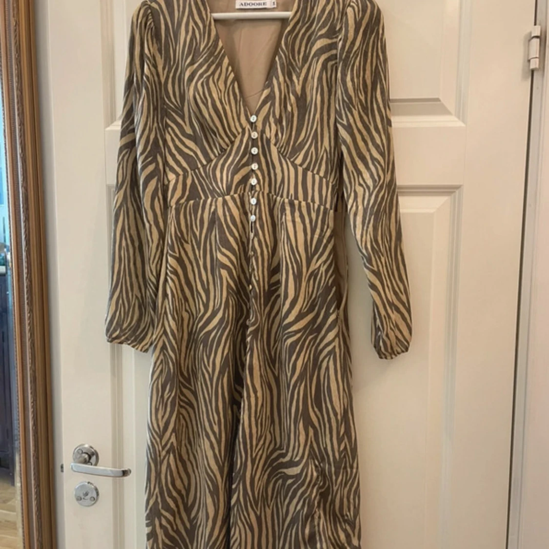 Snygg långklänning från Adoore med zebramönster i beige och svart. Klänningen har v-ringning, knappar framtill och långa ärmar. Perfekt för dig som vill sticka ut med ett djurmönster och en elegant siluett., den har en liten tråd om har gått upp men ingeting så syns!🩷