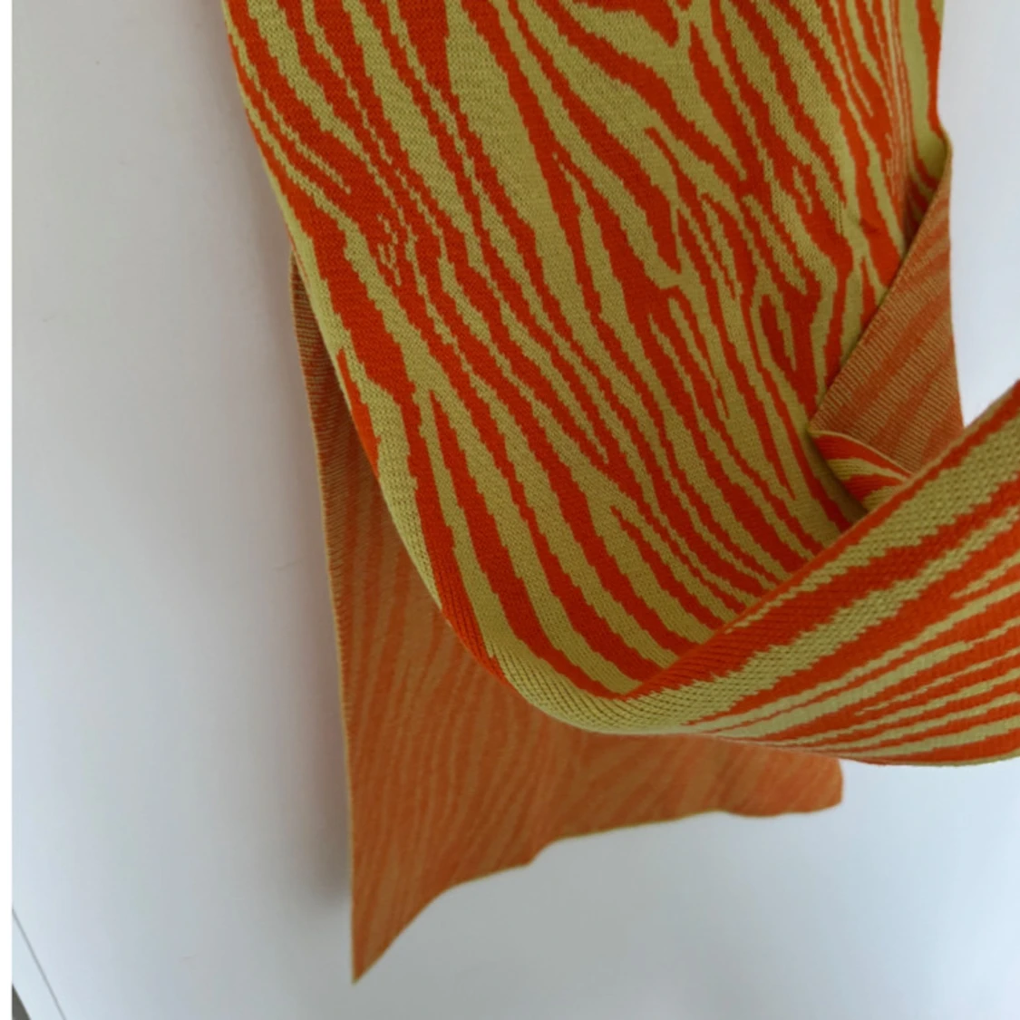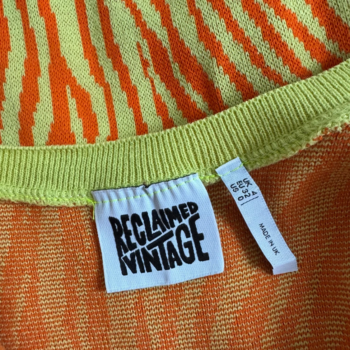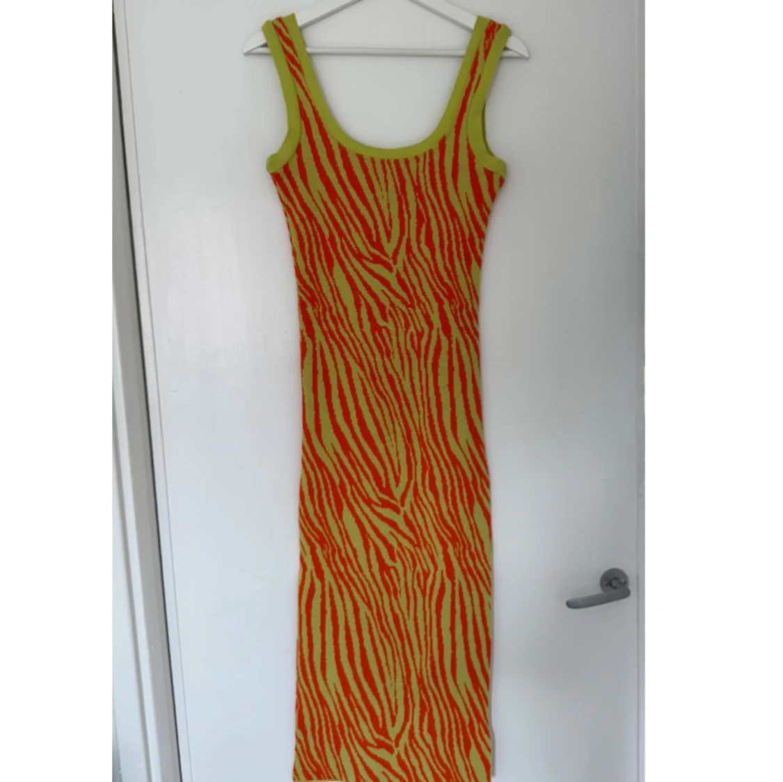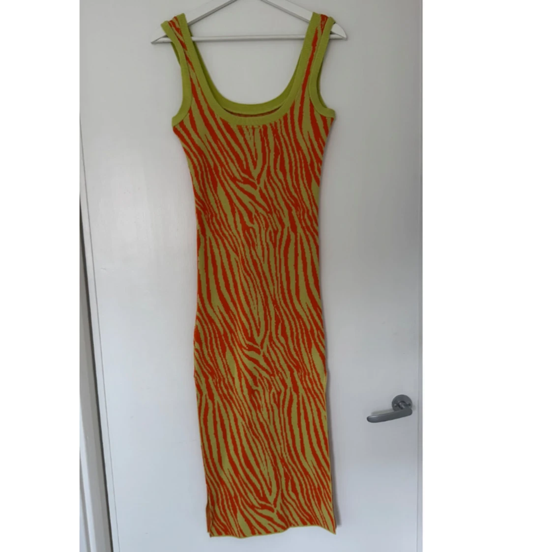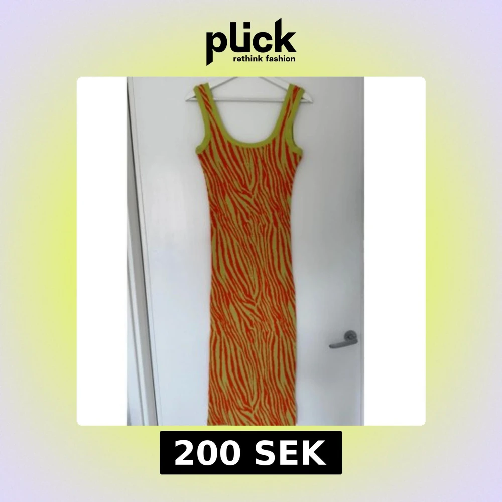 Aldrig kommit till användning tyvärr! Säljer en supercool, kroppsnära klänning i stickat material med iögonfallande zebramönster i limegrönt och orange. Från reclaimed vintage. Stretchigt material som formar sig efter kroppen. Lång modell, breda axelband, slits på sidorna. Perfekt för sommar, festival eller som statement-plagg. Jag har massor av varor till salu, köp fler och få rabatt!