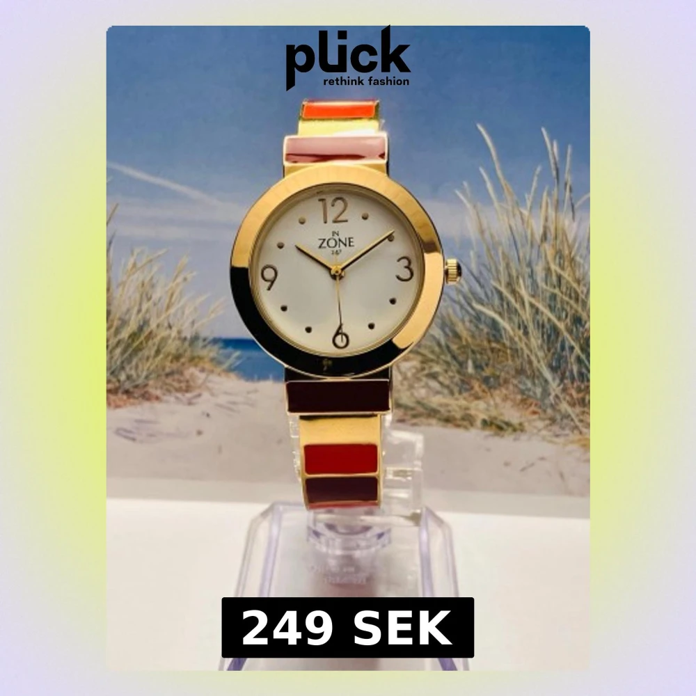 Snygg klocka från In Zone med guldfärgat armband och boett. Armbandet har inslag av rött, orange och beige i blockfärg. Urtavlan är vit med guldiga detaljer och siffror. Perfekt accessoar för dig som vill sticka ut lite extra.