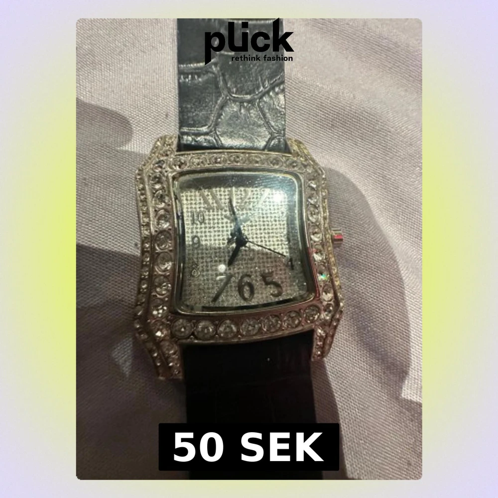 Snygg klocka med fyrkantig urtavla, glittrande stenar runt boetten och svart läderliknande armband med krokodilstruktur. Urtavlan är silverfärgad och dekorerad med stenar, vilket ger en lyxig känsla. Perfekt accessoar för att sticka ut. Funkar ej!
