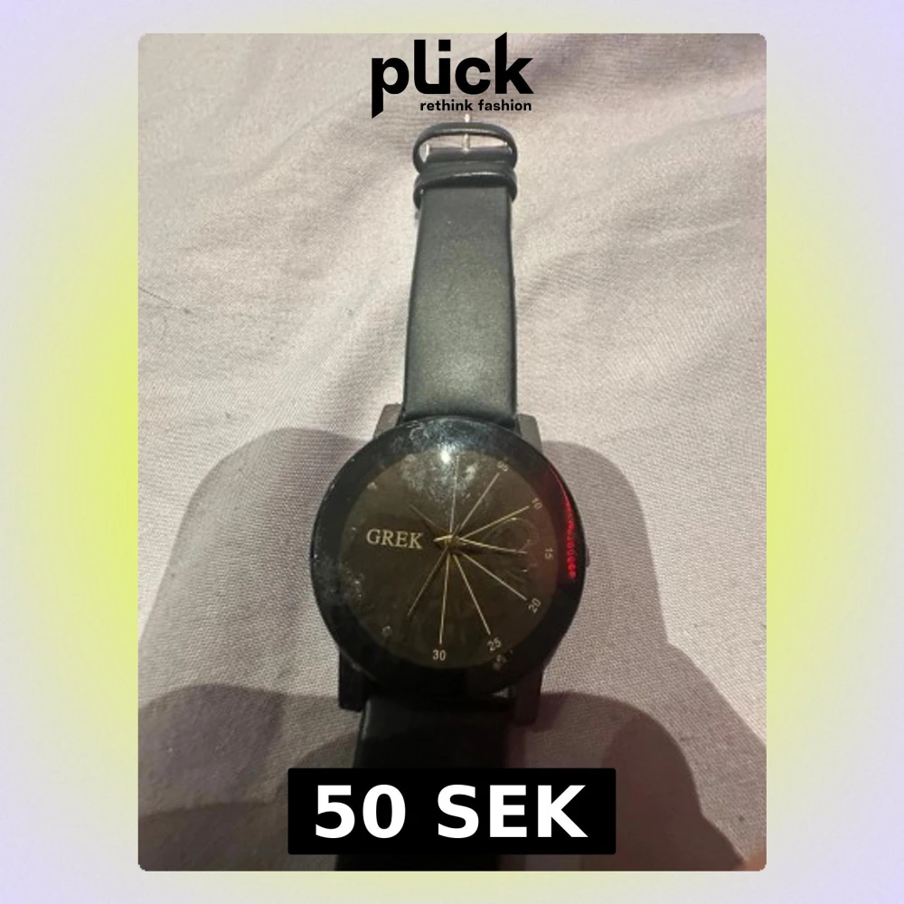 Stilren svart klocka från GREK med rund urtavla och guldiga visare samt detaljer. Klockan har ett svart band i syntetmaterial och minimalistisk design. Perfekt accessoar för att lyfta din outfit. Funkar ej!