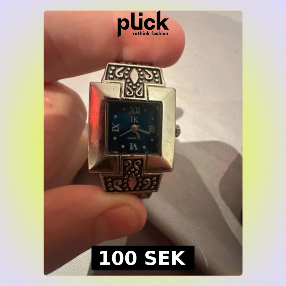 Unik klocka med fyrkantig blå urtavla och romerska siffror. Armbandet och boetten är i silverfärgad metall med snygga, detaljerade mönster. Perfekt accessoar för dig som gillar retrostil och vill sticka ut. Funkar ej!