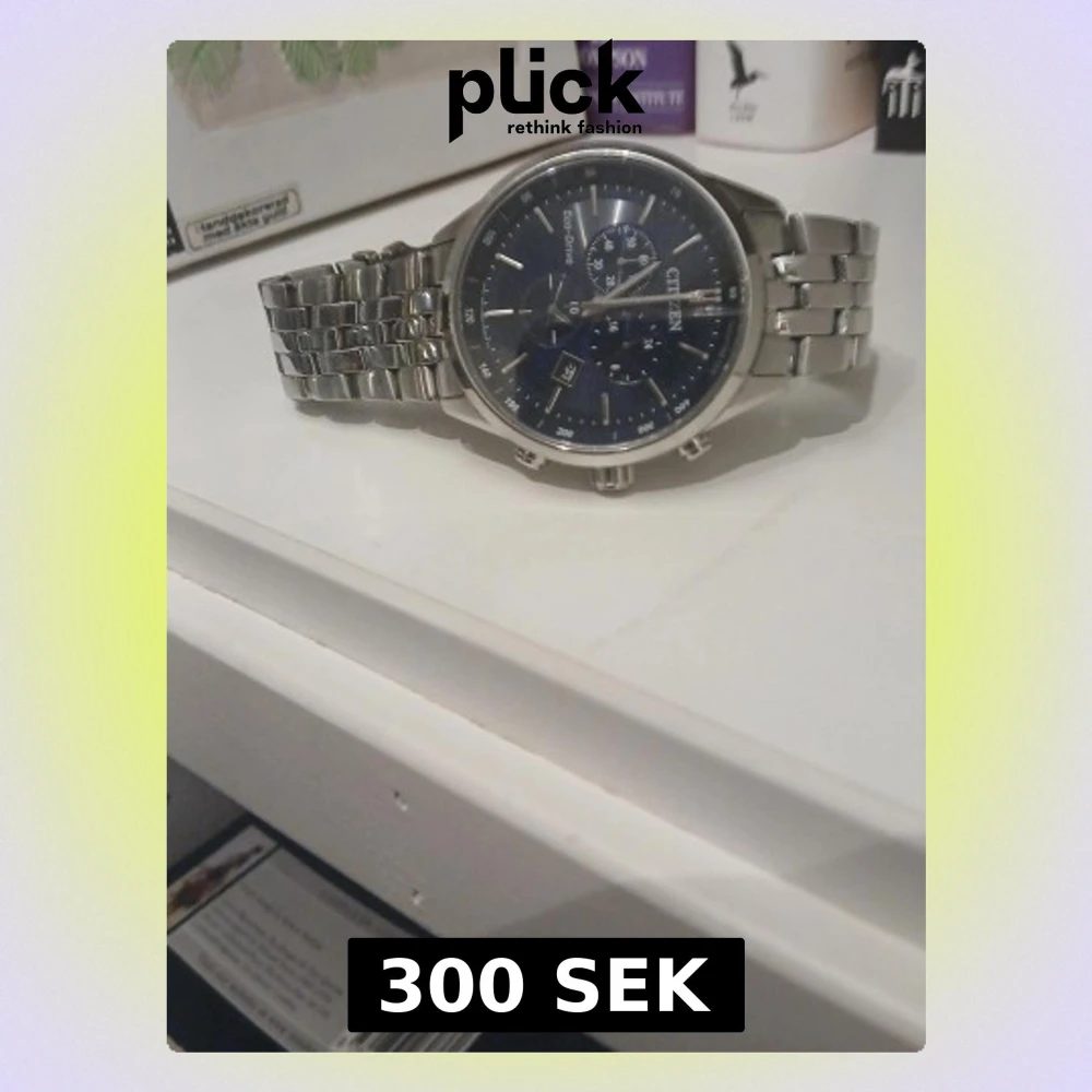 Citizen Eco-Drive klocka med mörkblå urtavla och silverfärgat armband i metall. Klockan har flera små urtavlor, datumvisning och klassisk länkdesign. Perfekt accessoar för dig som gillar en tidlös look. Se defekter på baksidan. Armbandet är 17 cm Pendlar från Alingsås till Skövde vardagligen. Med jämna mellanrum är jag även i Uppsala. Säg gärna till om ni vill mötas och slippa betala frakten och den extra kostnaden som plick sätter på priset. Ni betalar med swish isåfall :)