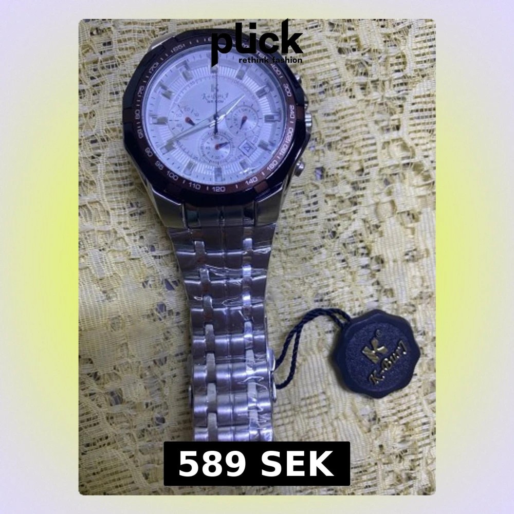 Stilren klocka från Kademan med silverfärgad länk i metall och vit urtavla med flera små urtavlor och tachymeter. Klockan har en sportig känsla och detaljerad design, perfekt för dig som gillar accessoarer med lite extra funktion. Nya klockan med nya batteri