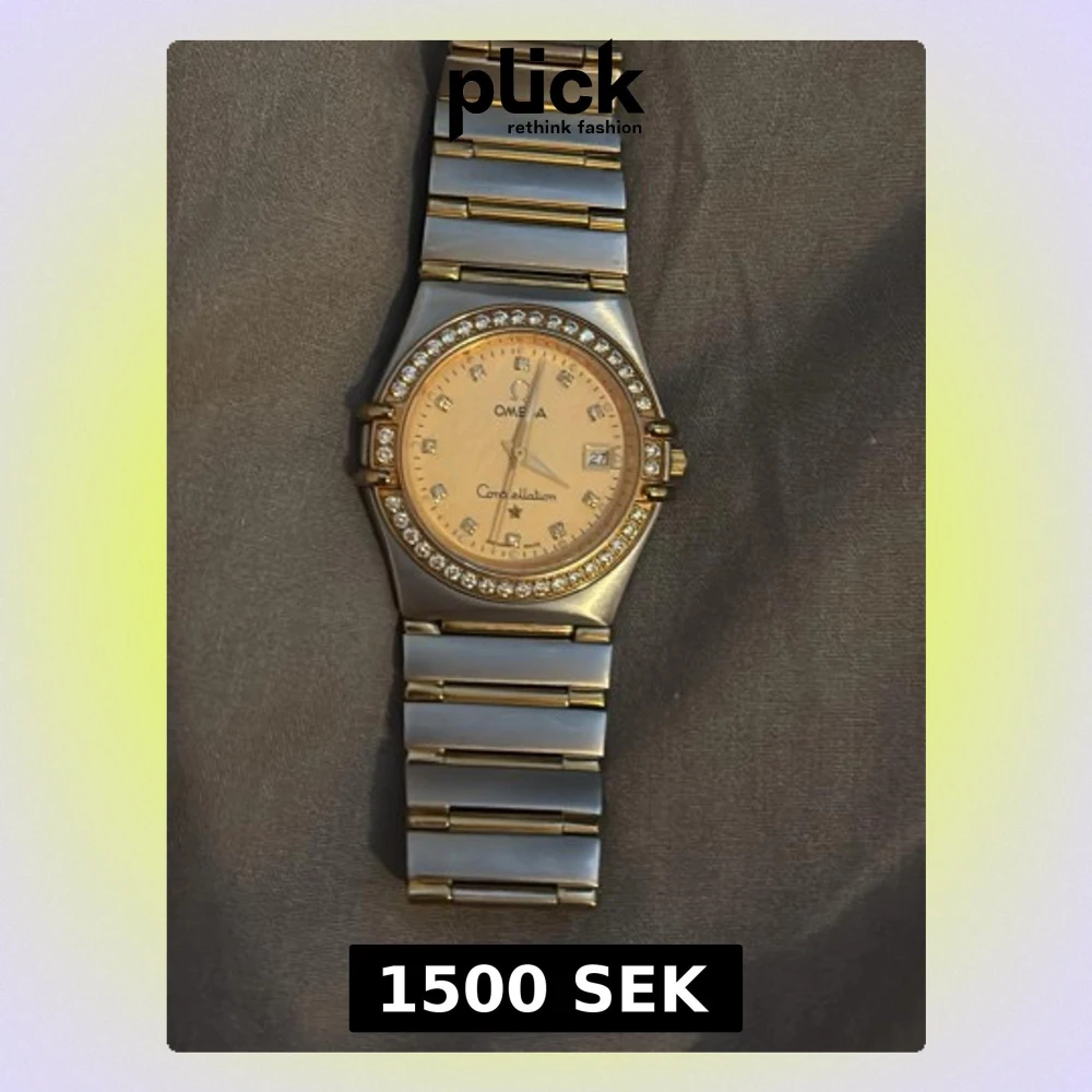 Snygg Omega Constellation klocka i silver och guld med länkarmband i metall. Urtavlan är beige med datumvisning och omgiven av glittrande stenar. Klassisk och exklusiv design med tydliga index och gulddetaljer.