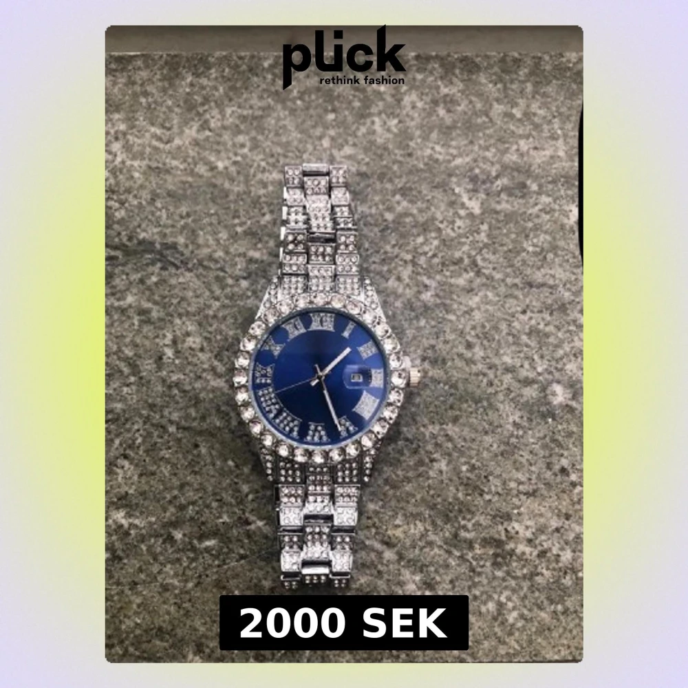 Snygg klocka med glittrande stenar på både armband och boett. Urtavlan är djupblå med silverdetaljer och datumvisning. Klockan har en lyxig känsla och passar perfekt för dig som gillar att sticka ut.