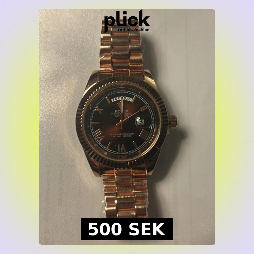 Snygg guldfärgad Day-Date med mörkbrun urtavla och dag- samt datumvisning. Klockan har en klassisk länkarmband i metall och markerade index. Perfekt accessoar för dig som vill sticka ut med stil.