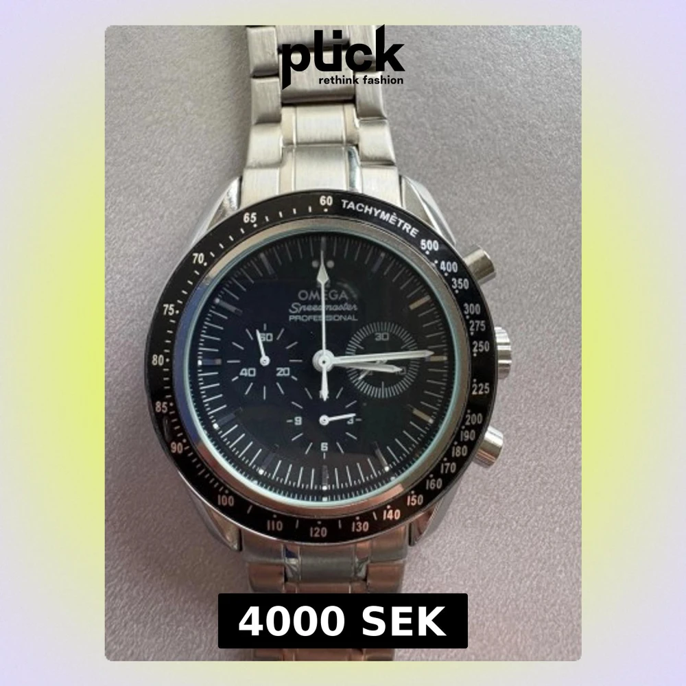 Säljer en klassisk Omega Speedmaster Professional med svart urtavla, tachymeter-ram och länkarmband i silverfärgat stål. Klockan har kronograf och flera subdials. Extra länkar medföljer så du kan justera storleken enkelt.