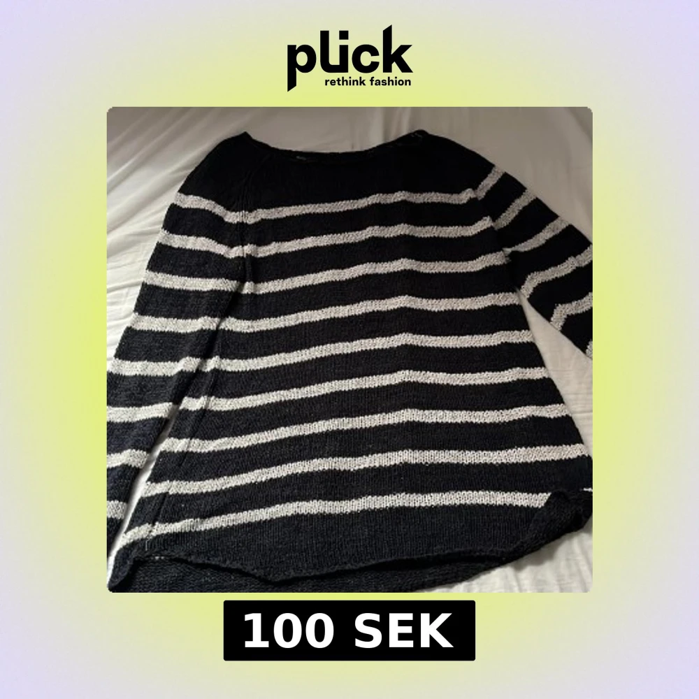 Säljer en svart och vit randig stickad tröja med lång ärm. Tröjan har en avslappnad passform och är perfekt för kyligare dagar. Mjukt material och klassiskt mönster som passar till mycket.